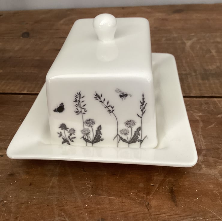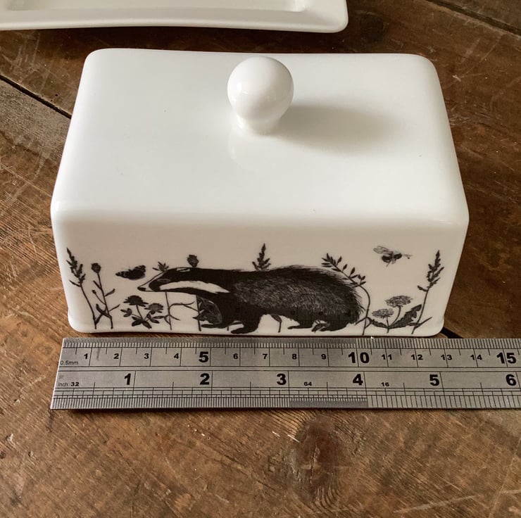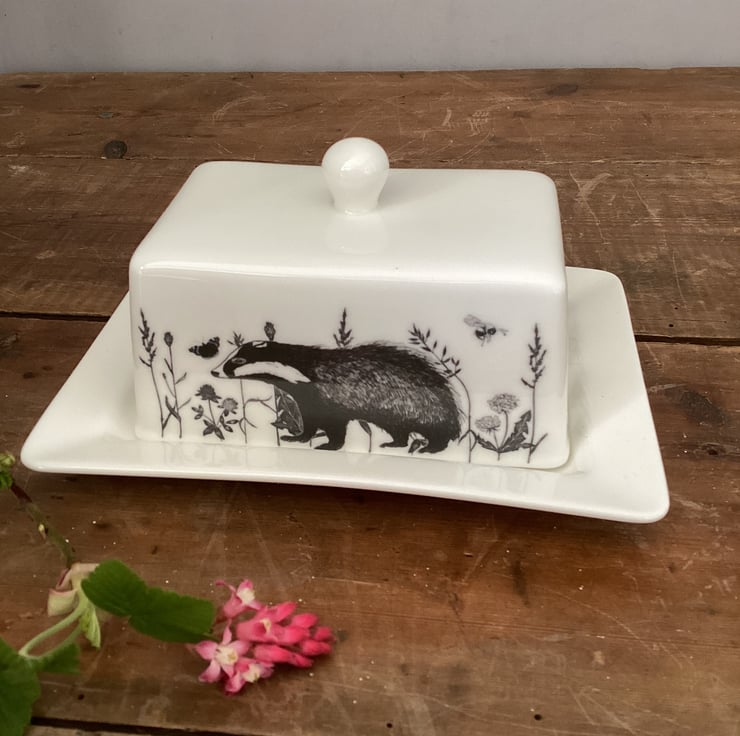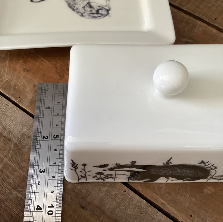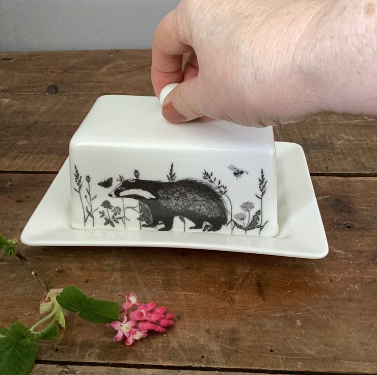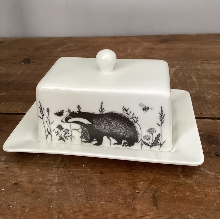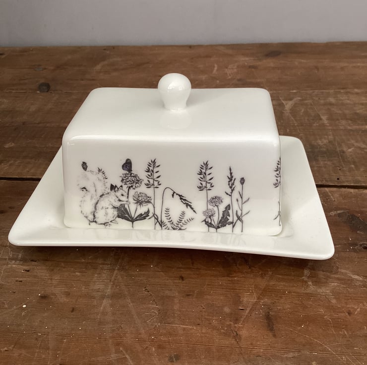 This stylish bone china butter dish is decorated with a flora and fauna theme. Badger, squirrel, bees and butterflies and a hare are interspersed with plants and grasses