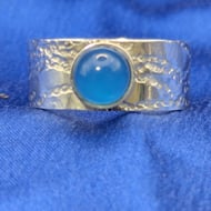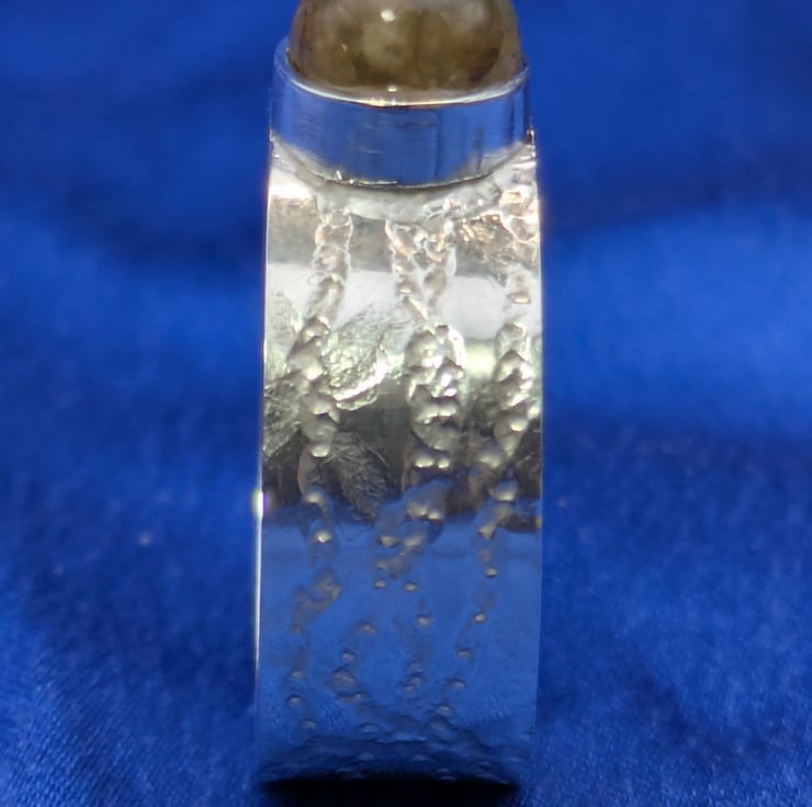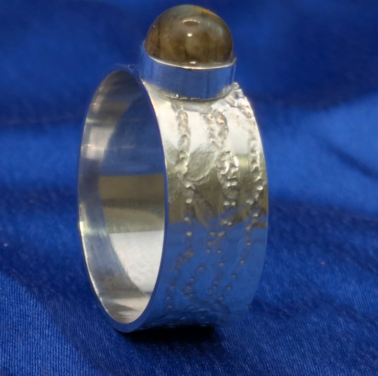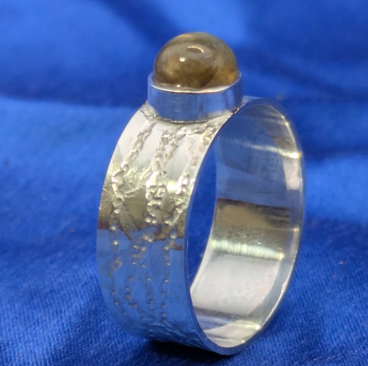 Unique handmade silver ring is made from recycled 925 sterling silver with lace imprint pattern. Set with 6 mm diameter Labradorite cabochon which is used in crystal healing to shield against negativity, enhance intuition, and boost self-confidence. This size O ring is perfect for those looking for a unique and fine jewellery piece to elevate their outfit, and would make a stylish addition to any jewellery collection. Made with attention to detail and exquisite craftsmanship, This, ring is a versatile accessory that can be worn for any occasion.