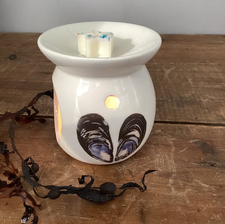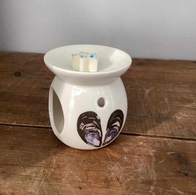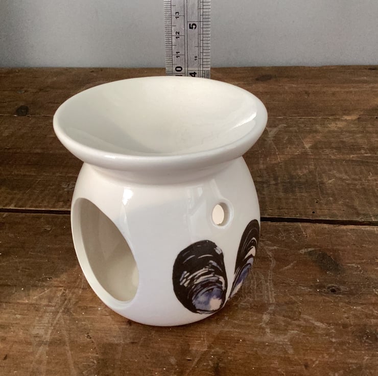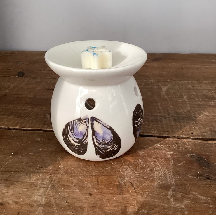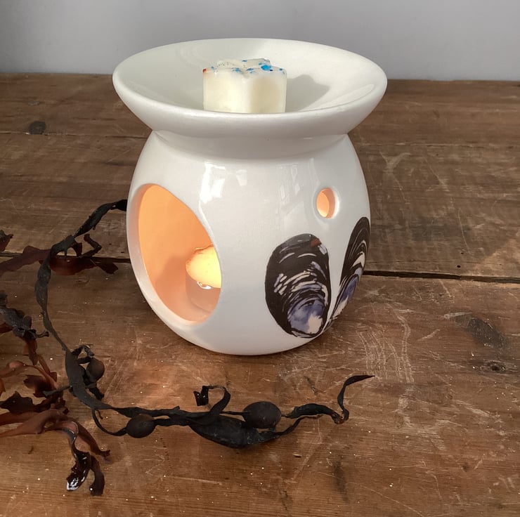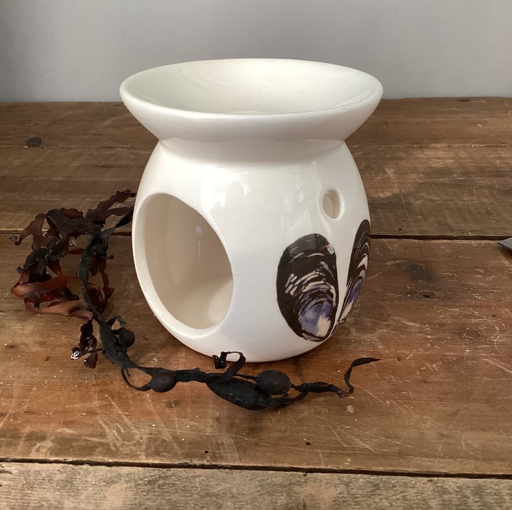 This stylish ceramic wax melt/oil burner is decorated with mussel shells. Designed to hold a tea light and create a fantastic scented ambience in your home. A reliable choice for use with your wax melts, whilst giving a coastal look to your home.