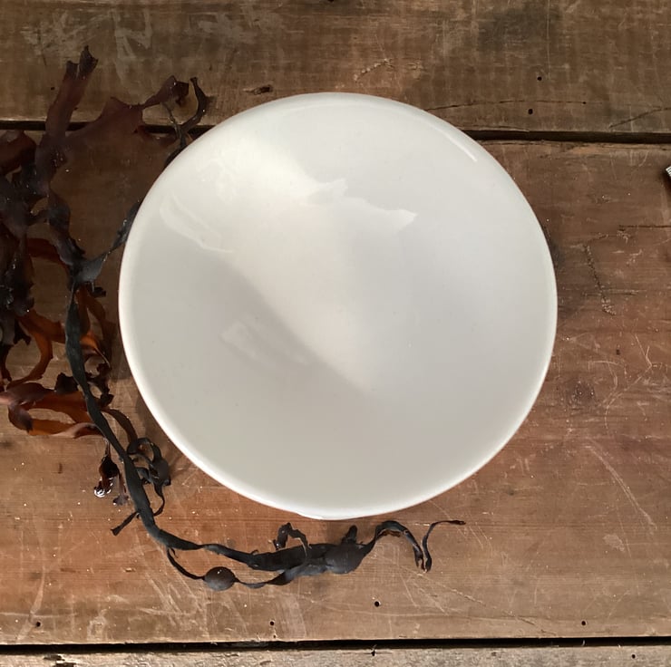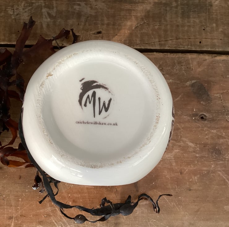The mussel shell design was originally a linocut with added watercolour detail. My design is printed onto decals which I apply by hand and fire in the kiln.