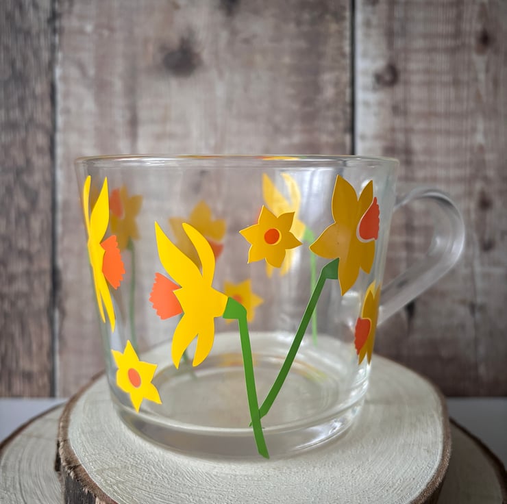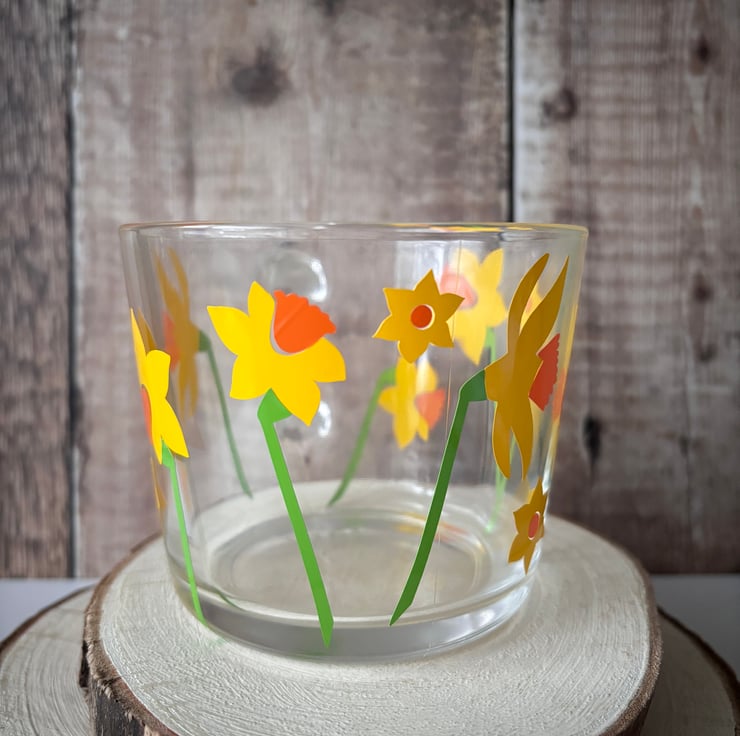 All phrases have been digitally hand drawn then cut in permanent vinyl with hand drawn daffodils. Each glass may vary due to their hand made nature.