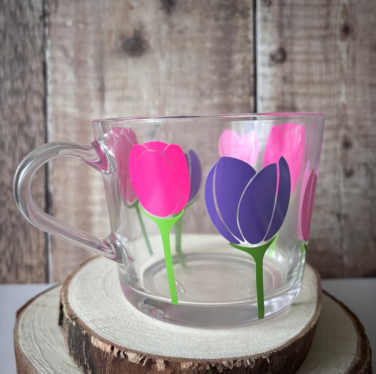 Tulip Glass Coffee Mug, Hand-Lettered Floral Design