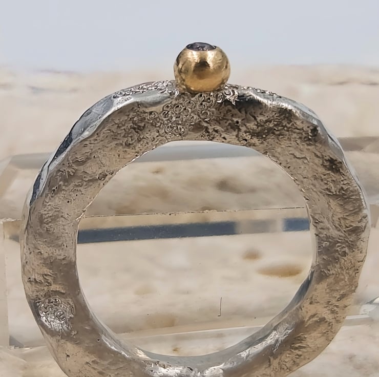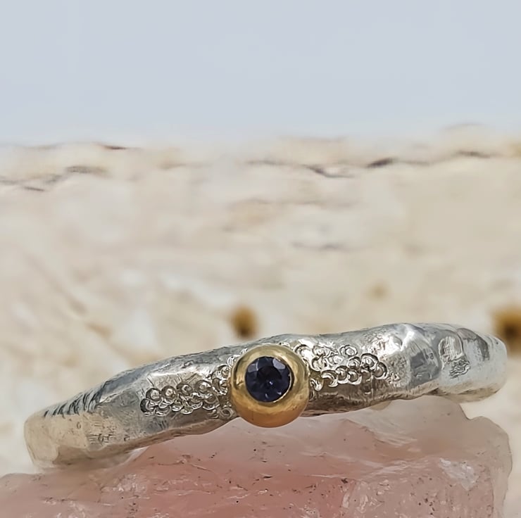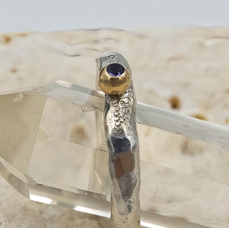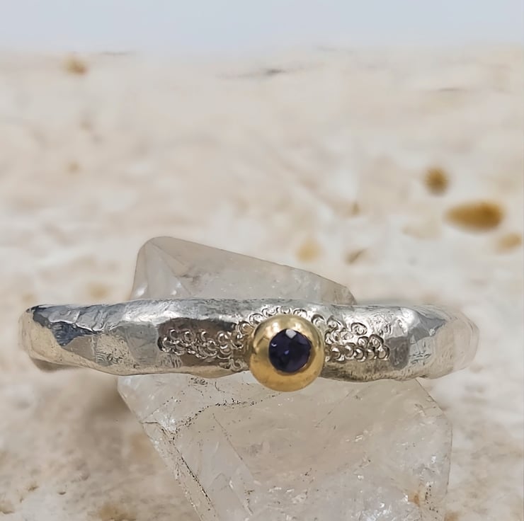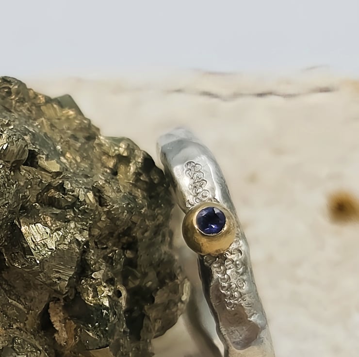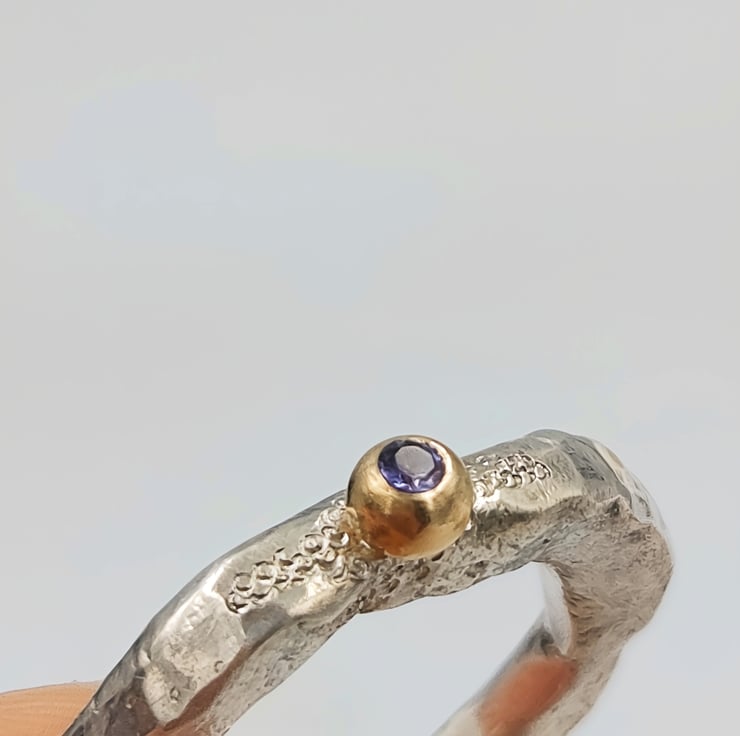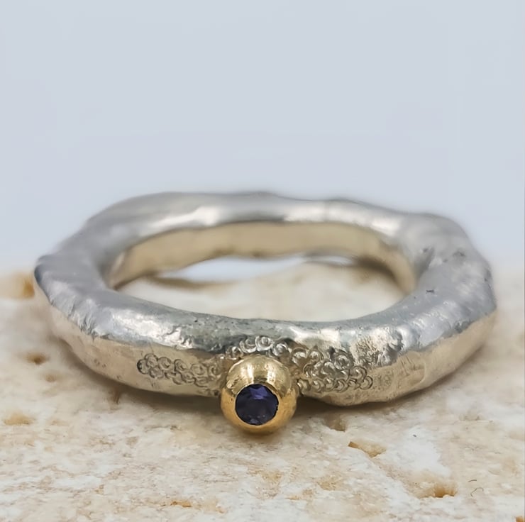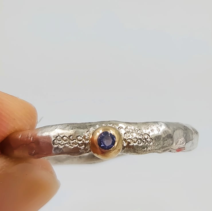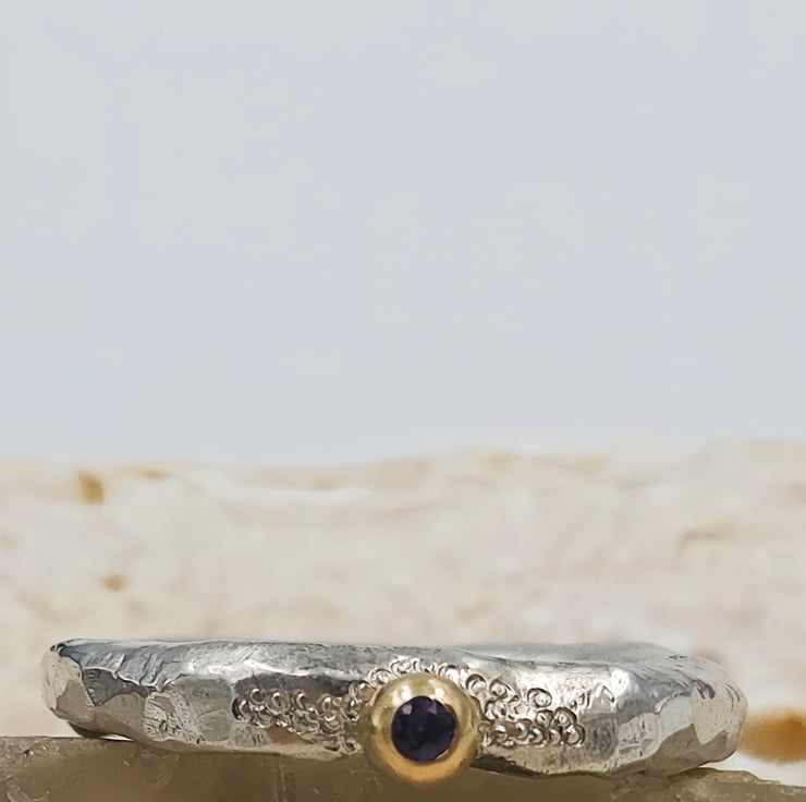 A flush set 2mm iolite glows softly from within the 9ct gold granule, shifting between blue and violet like twilight stone. A 9ct gold granule is fused onto the band, adding a warm, natural accent reminiscent of found gold in raw ore.
