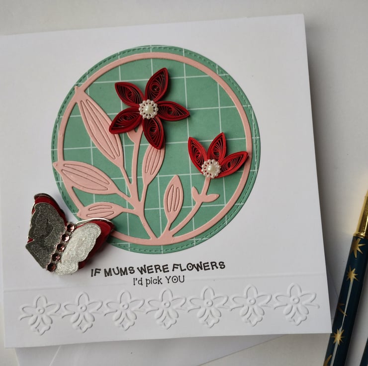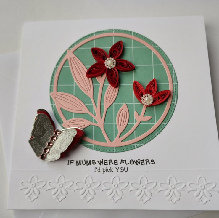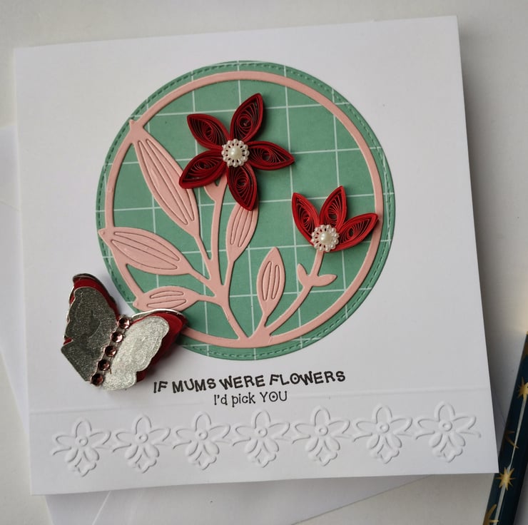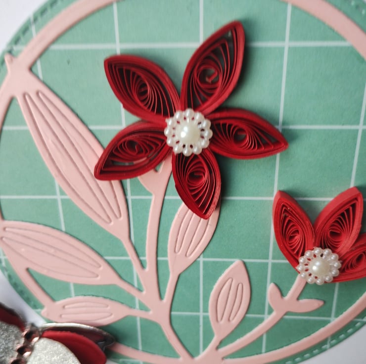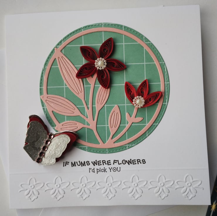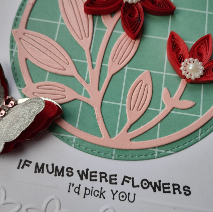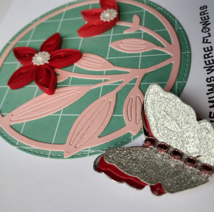 I've quilled two beautiful dark red flowers for this card. I've die cut a stitched circle in patterned green card as a background and layered a die cut image of stems and leaves from pretty pink coated cardstock. For extra dimension and detail I've added pearl flowers to the petals of the flowers. I've cut and layered three times a butterfly in silver, red and silver glitter card with a line of pink diamante style gems for added interest.
