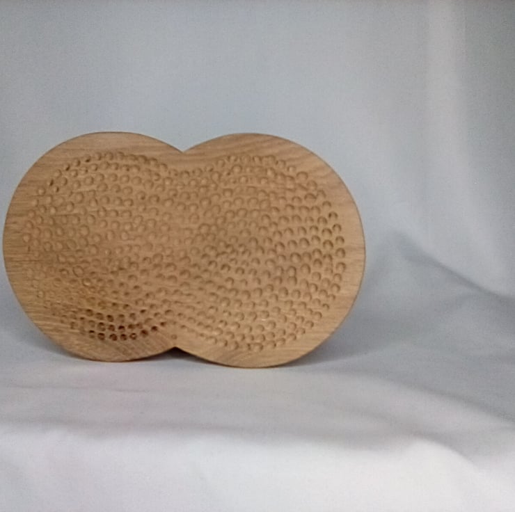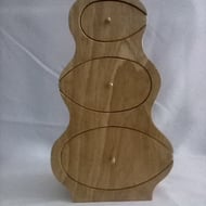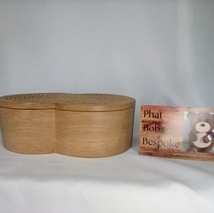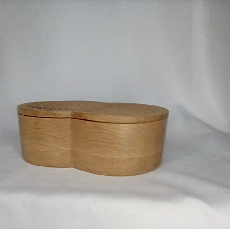 Hand made oak trinket box with swivel lid boasting a hand carved dappled lid with a smooth action and tapered sides gives this box a unusual design perfect for storing that every day jewellery or something personal standing 6cm high 17cm wide and 11cm deep finished in a natural wax to enhance the beauty of the wood