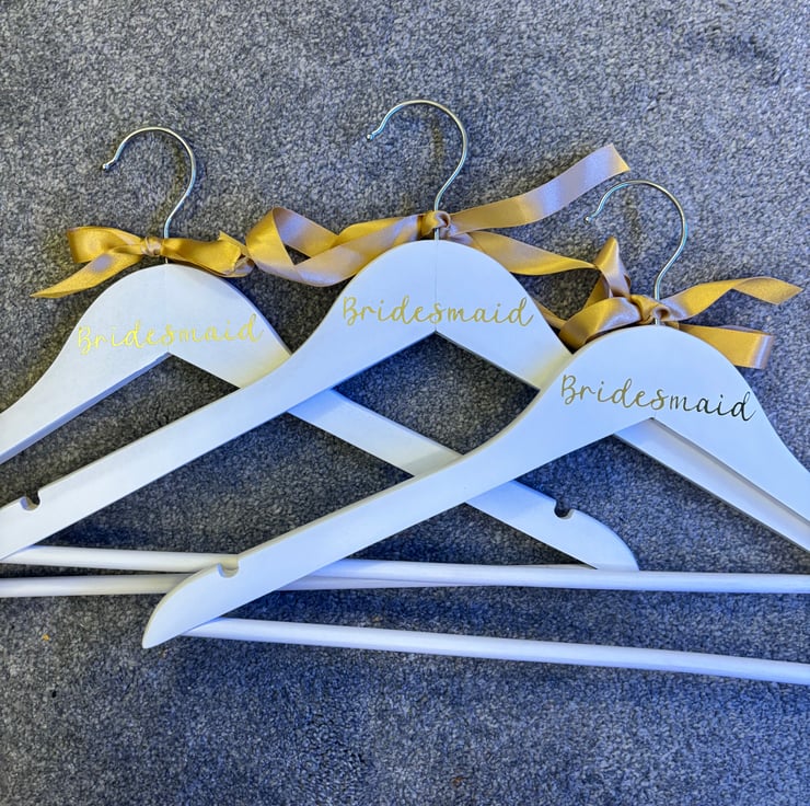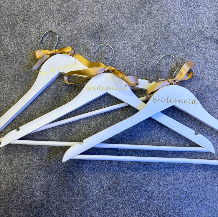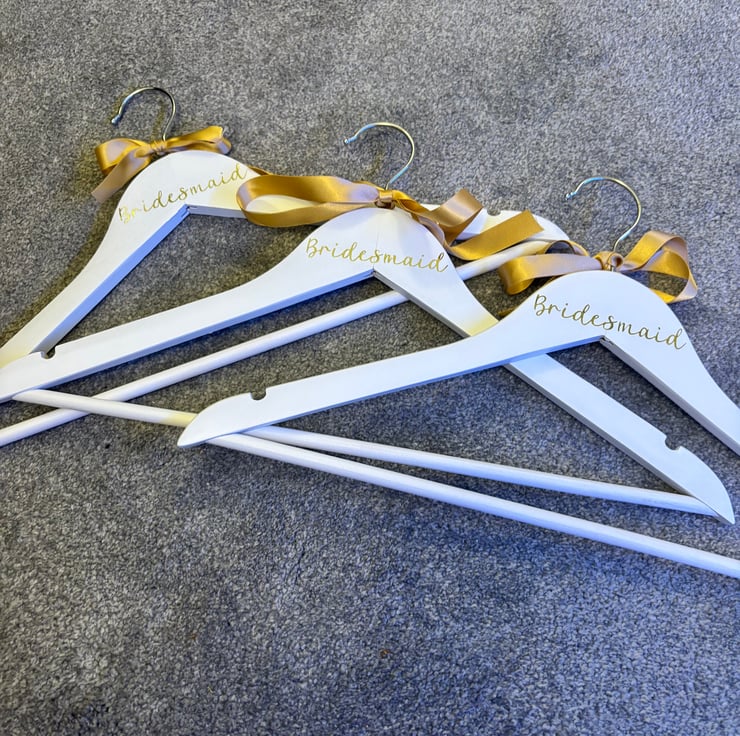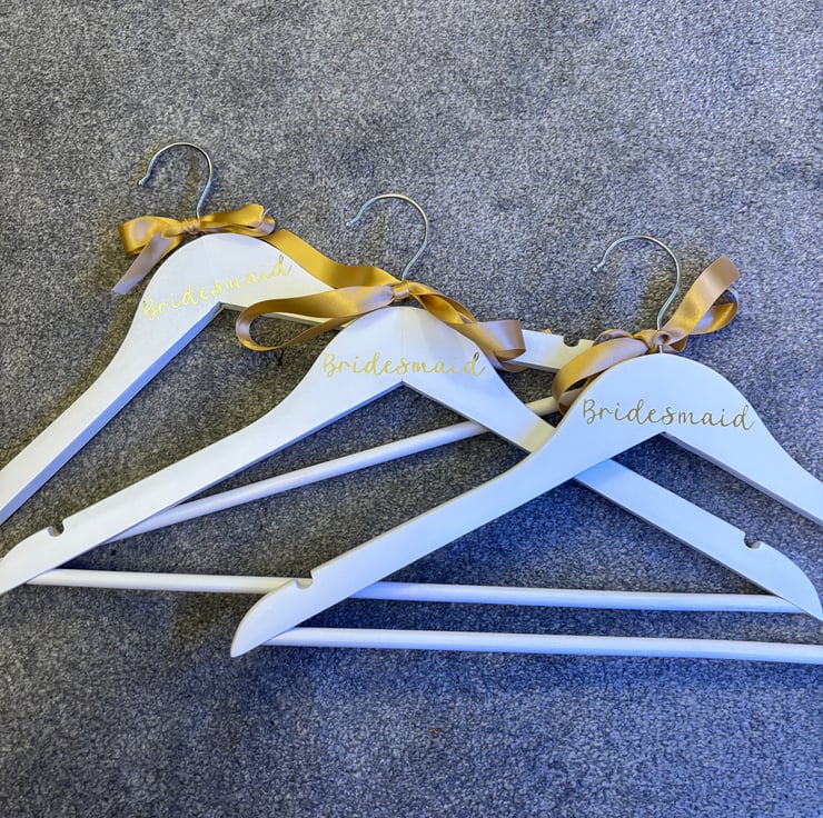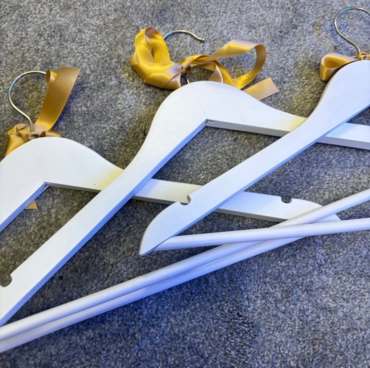 Each hanger is carefully prepared with a smooth white finish and finished with a soft gold ribbon bow for a simple, elegant look that suits many wedding colour themes.