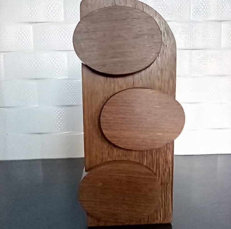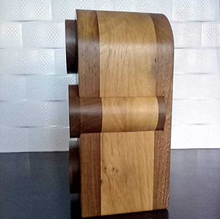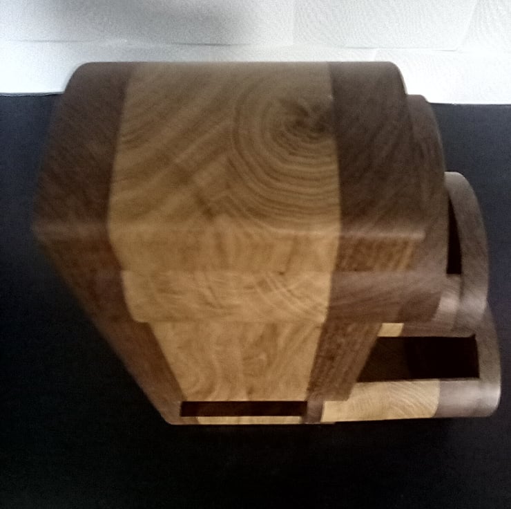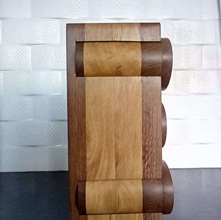 Bespoke hand crafted panga panga and oak jewellery / trinket box with beautiful curved drawers protruding from the front and side of the body giving it a unique design, mixing local and exotic hardwoods to give it a perfect warm and natural look with flecks of yellow sparkling through from the panga standing 26cm high 12cm wide and 12.5cm deep