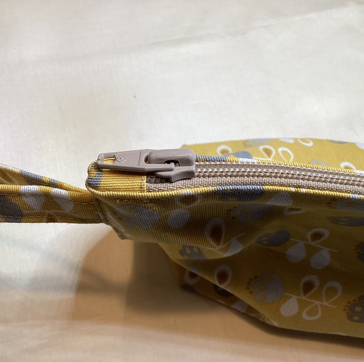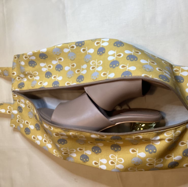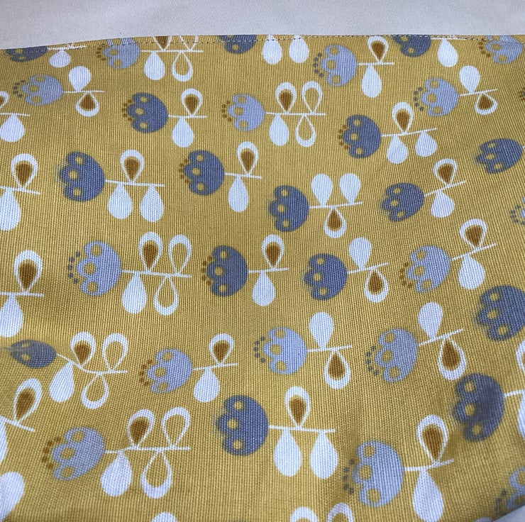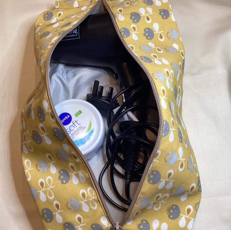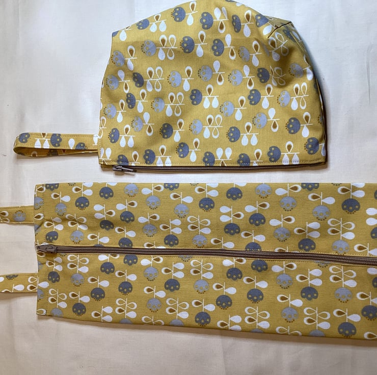 Matching shoe / hairdryer bag (46 x 25cm) and toiletry bag (28 x 20cm) with carry / hanging straps. One set only so unique to you. Mustard, grey and cream colour with grey lining. Cotton blend outside, synthetic lining, hand washable. Hand made, neatly finished. Hand washable.