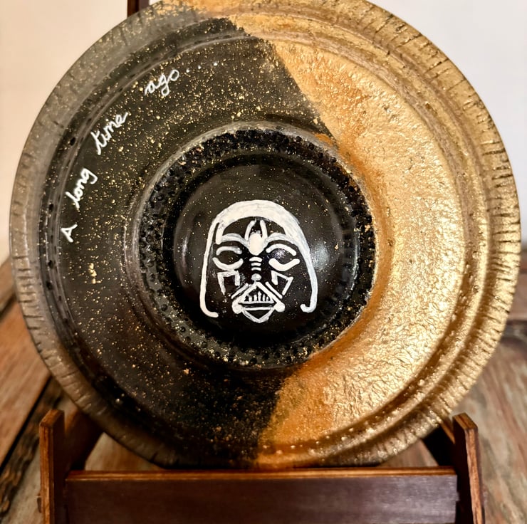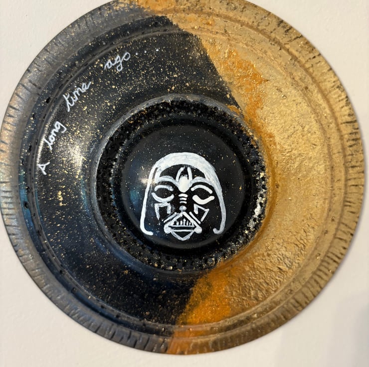 The background is painted black, with contrasting metallic details: a hint of silver on one side and gold leaf on the other. At the centre is a striking negative outline of Darth Vader’s helmet painted in white, creating a bold focal point. Around the outer ring the phrase “A long time ago” has been hand-painted, inspired by the iconic opening of the saga.