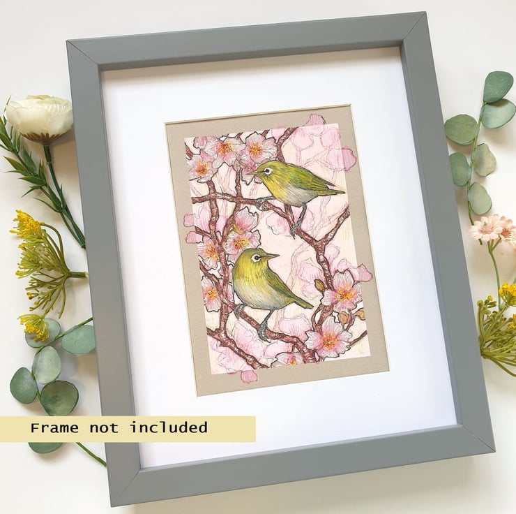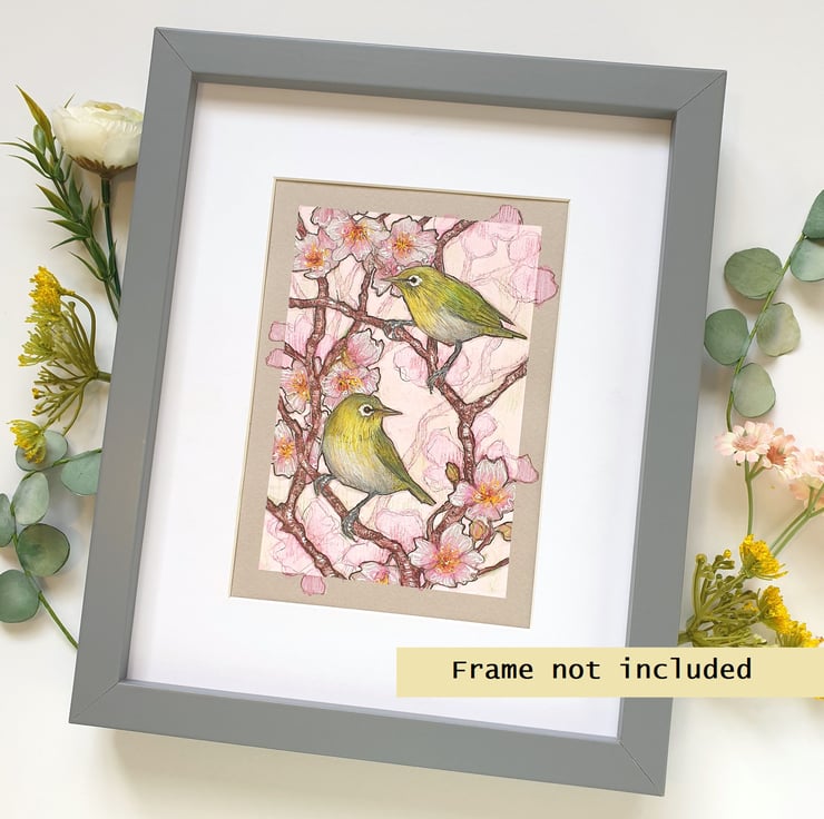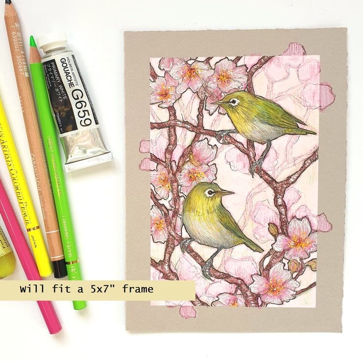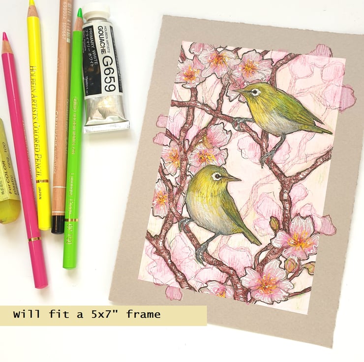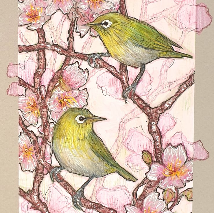 A small drawing in colour of two Japanese white-eye birds sitting on branches with pink spring blossoms. The background is a very light shade of pink.