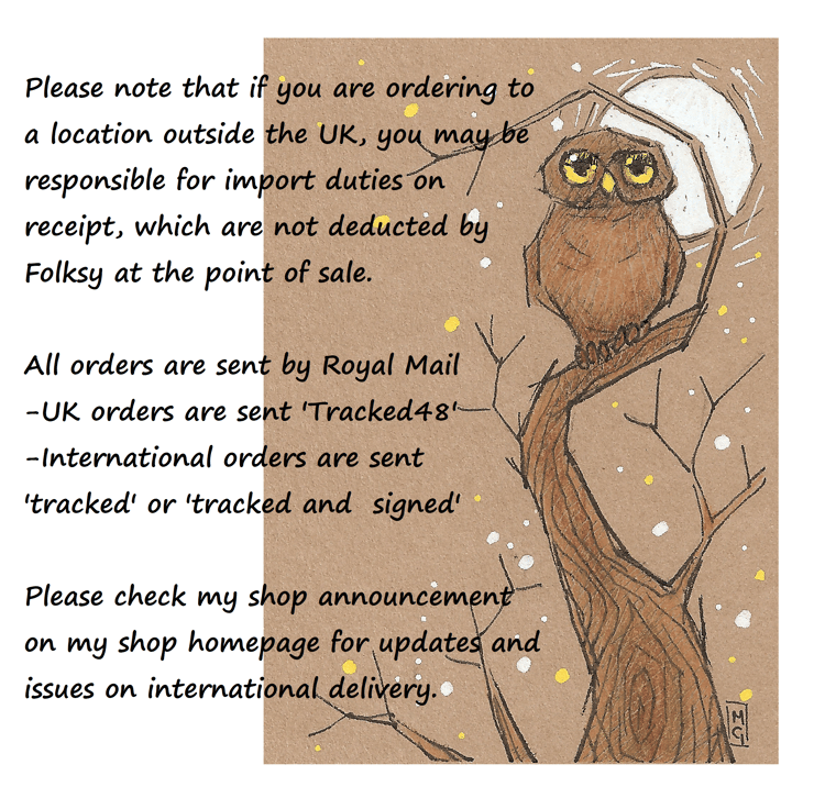All orders are sent by Royal Mail -UK orders are sent 'Tracked48' -International orders are sent 'tracked' or 'tracked and signed' Please check my shop announcement on my shop homepage for updates and issues on international delivery. PLEASE NOTE: The price of artworks that are returned to me as 'uncollected or undelivered' for any reason, including non payment of charges, will be refunded, however your postage charges will not be refunded in these circumstances.