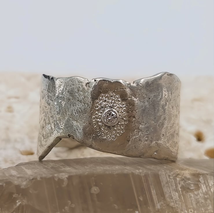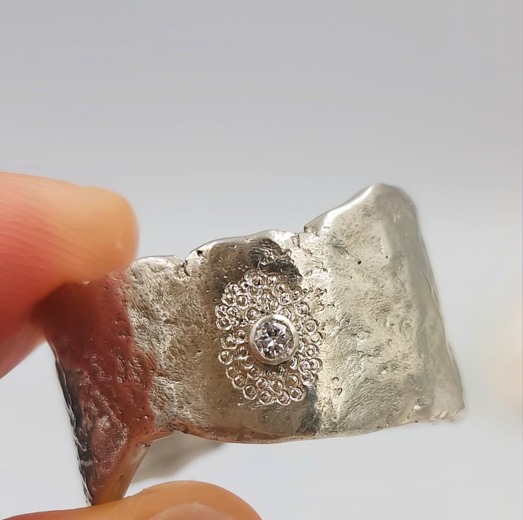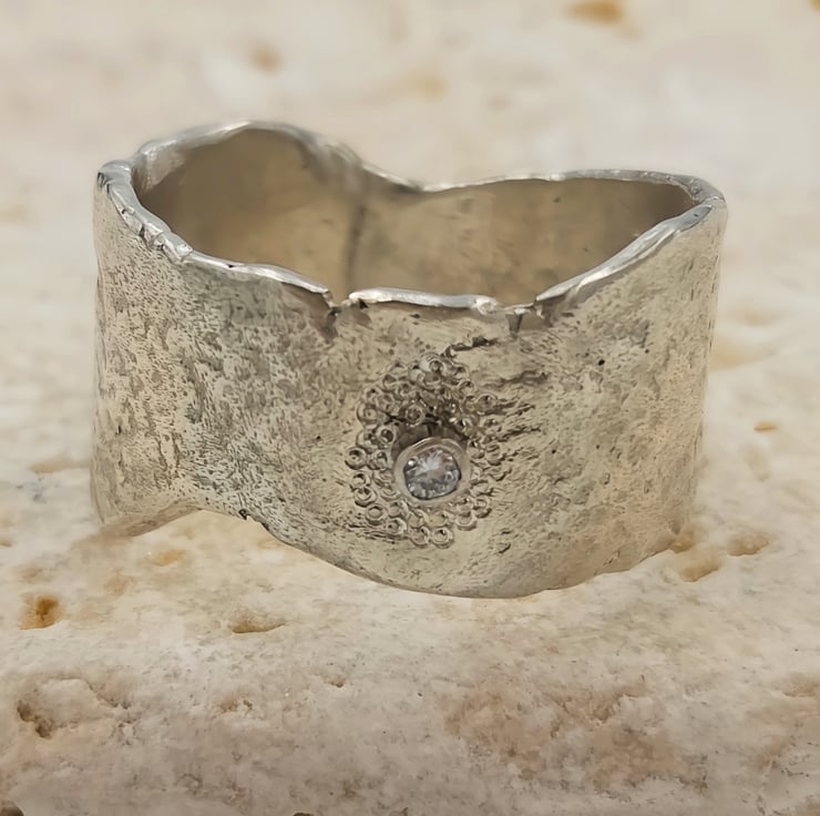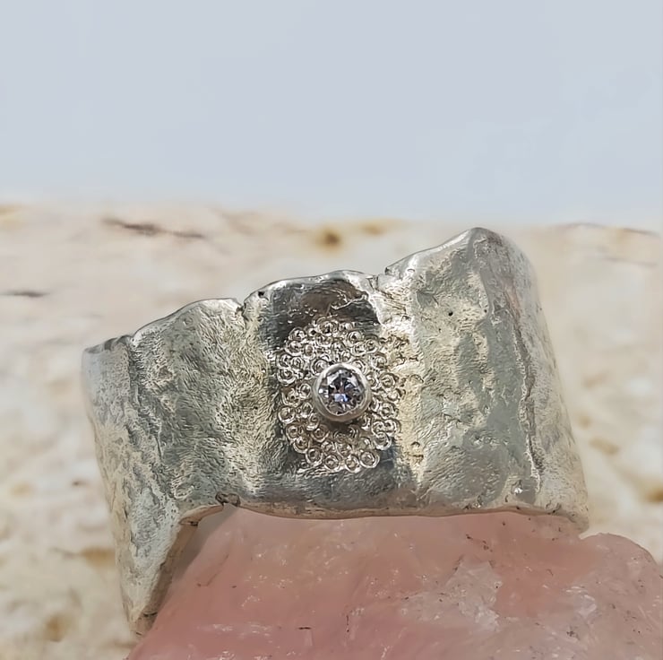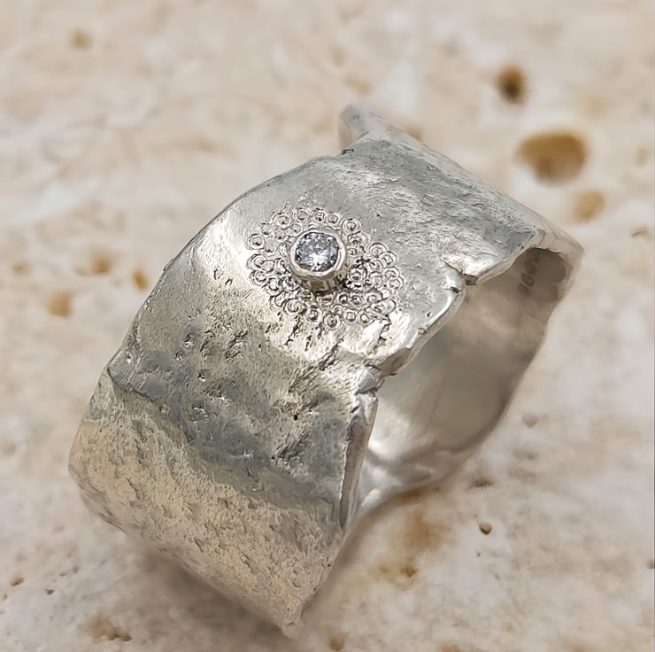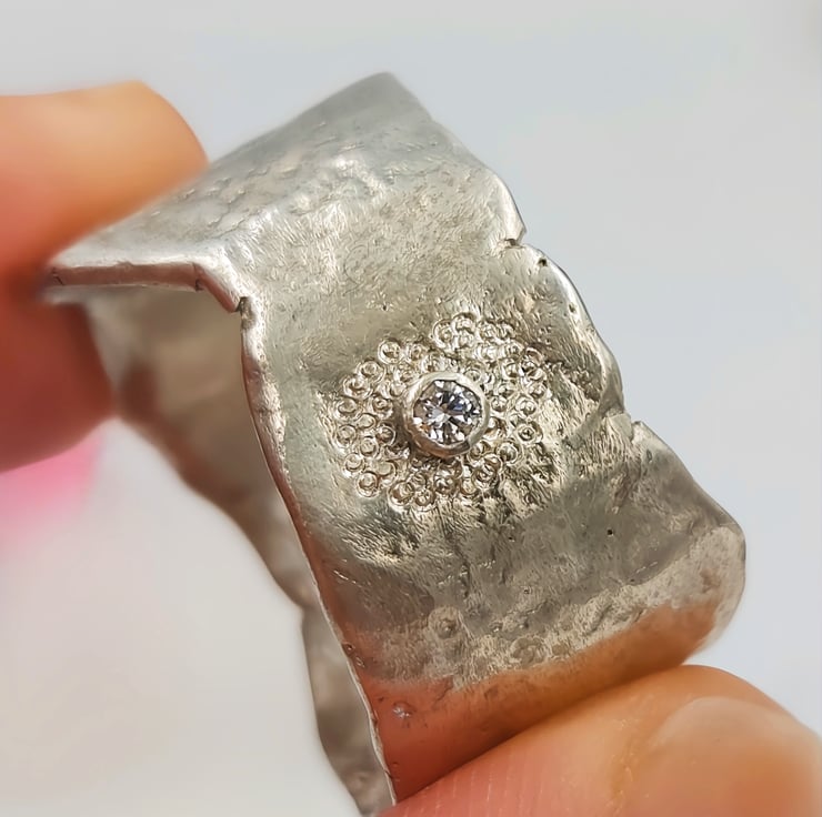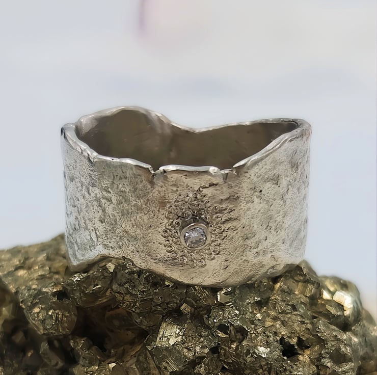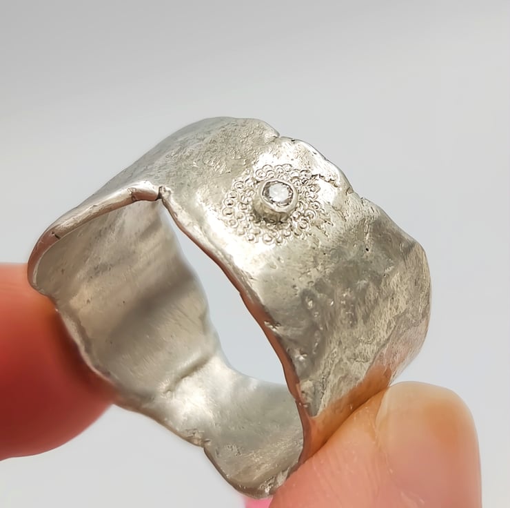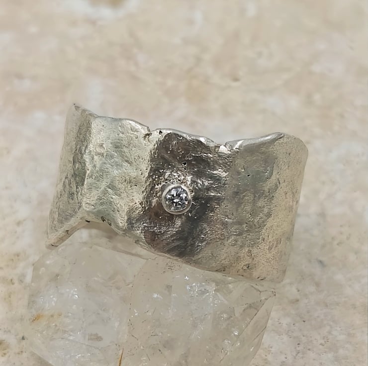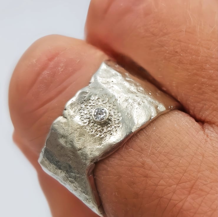 A single 2mm lab grown white diamond is tube set onto the band, adding a subtle sparkle that contrasts beautifully with the rugged, molten surface. The wide band has a substantial, weighty feel while remaining comfortable for everyday wear.