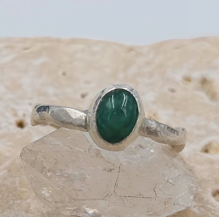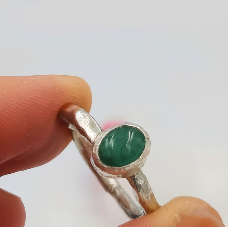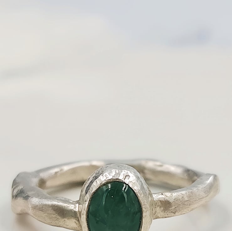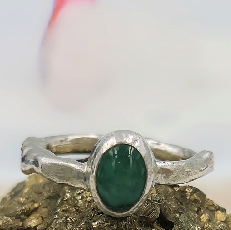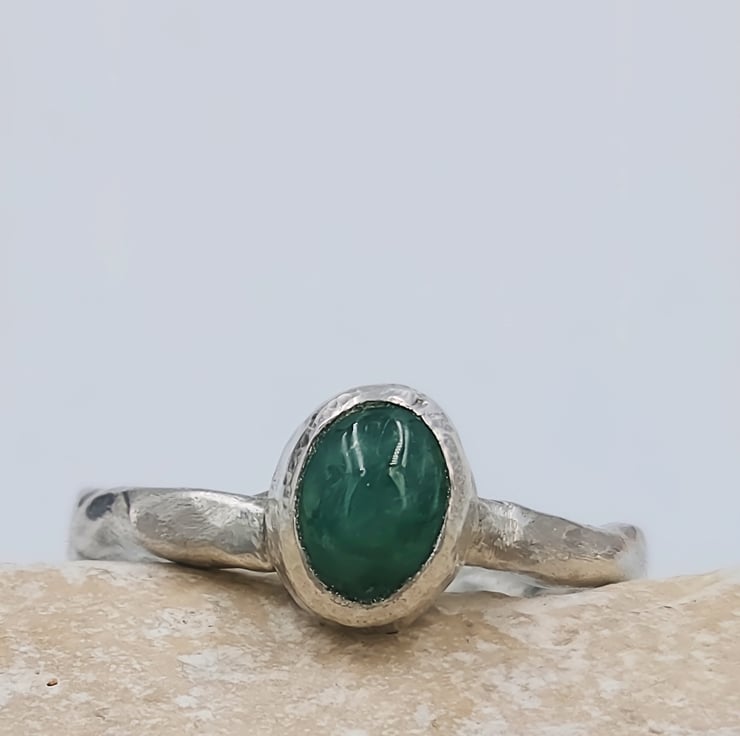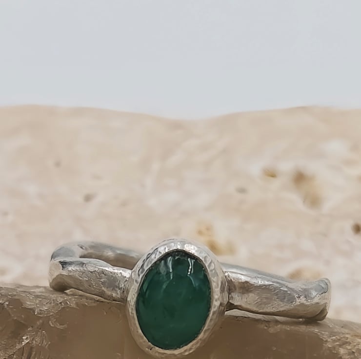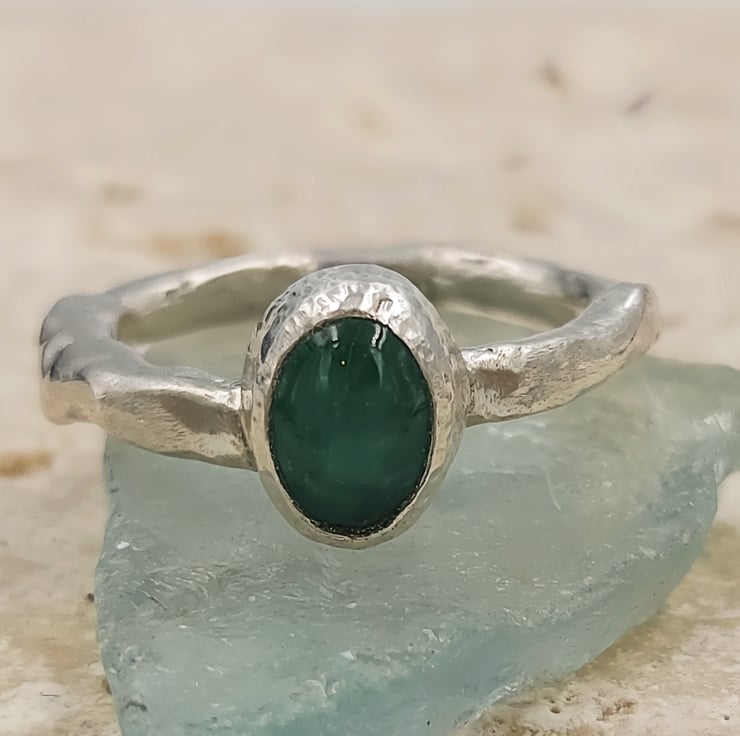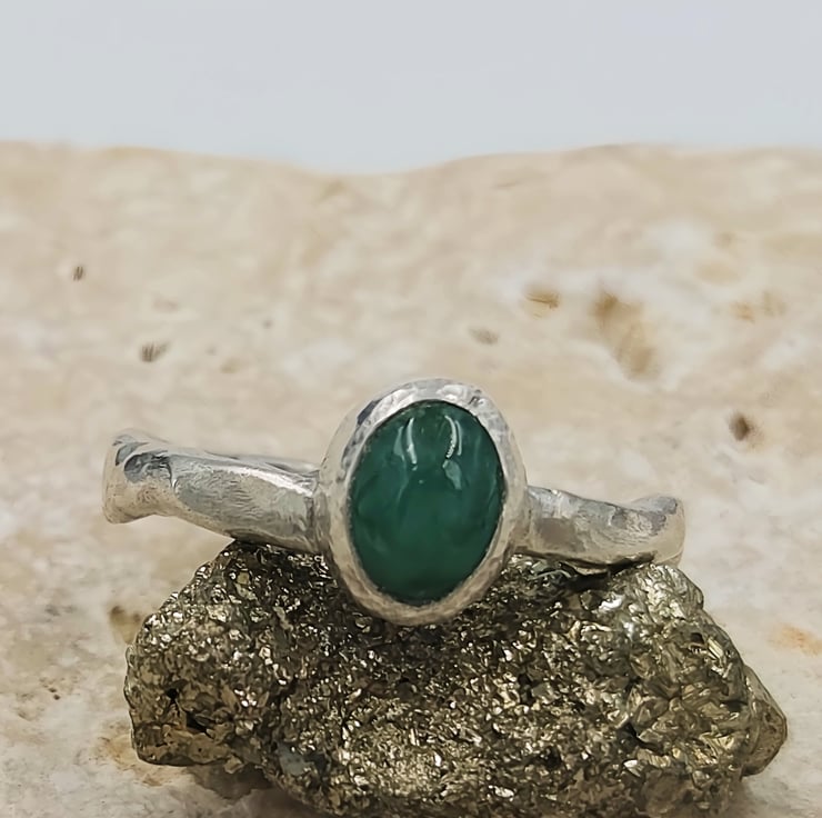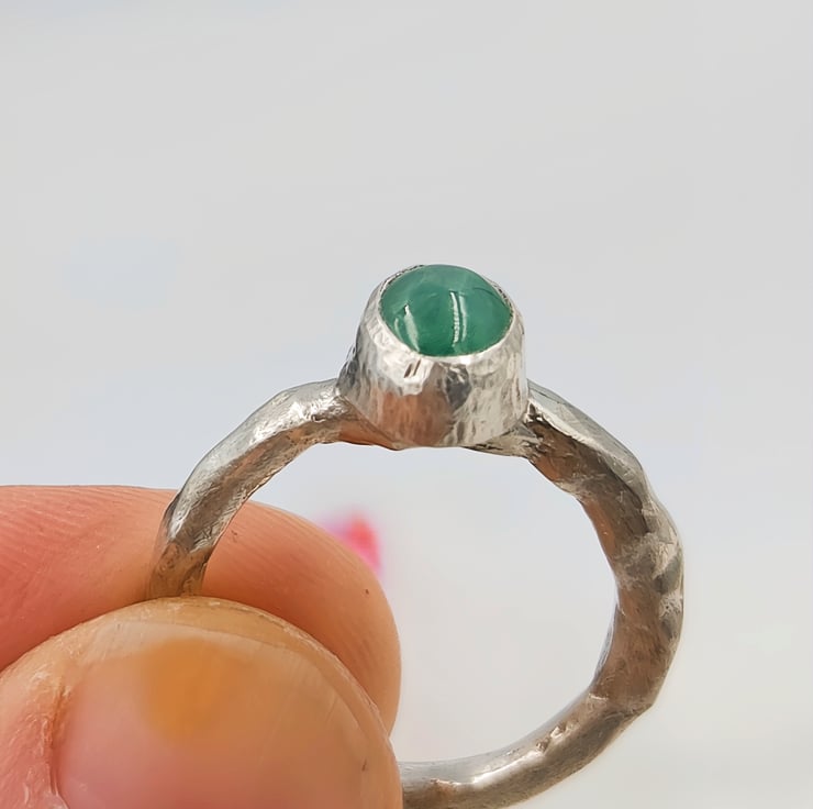 A small emerald cabochon is set into the silver, its deep green glow offering a beautiful contrast to the rugged molten finish. The smooth cabochon cut highlights the natural depth and richness of the emerald, adding a timeless, understated elegance to the piece.
