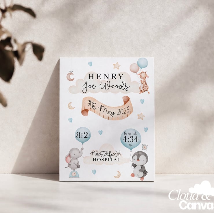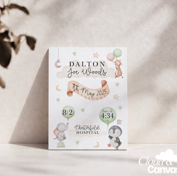 Celebrate the arrival of your little one with this charming, personalised watercolour birth announcement. This custom designed print is the perfect way to commemorate your baby’s first milestones. Featuring a watercolour aesthetic with adorable safari animals, it serves as both a precious keepsake and a stunning piece of nursery décor.