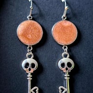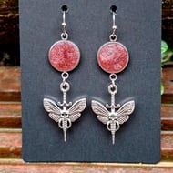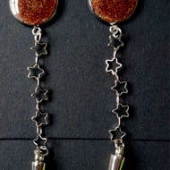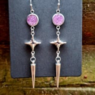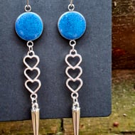 Each Quirken Trovery pair of earrings are hand created. These have a green-holo resin-filled cabachon with a spike drop. These are dangly earrings for pierced ears.