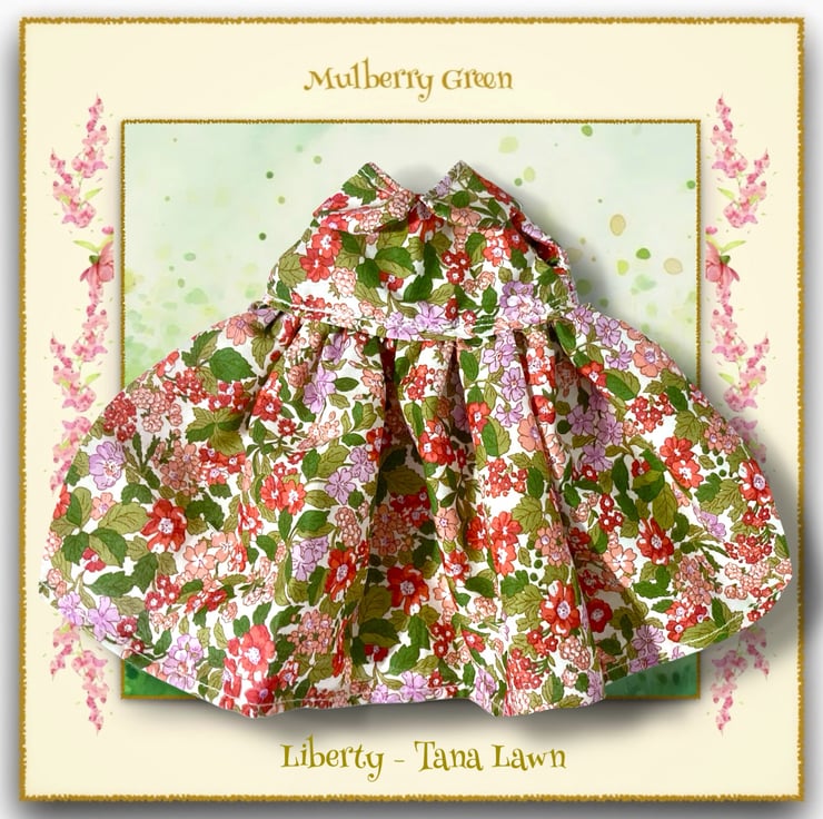 A beautiful dress in Liberty Tana Lawn floral fabric, to fit the Mulberry Green characters. The dress is made from best quality designer cotton and has a Peter Pan collar and a lined bodice.