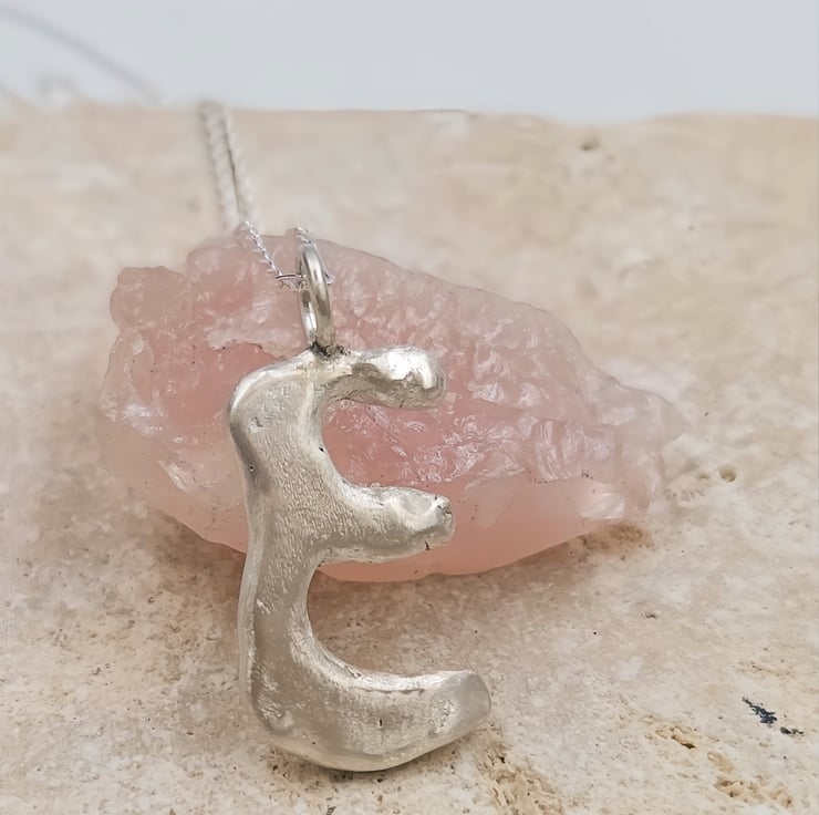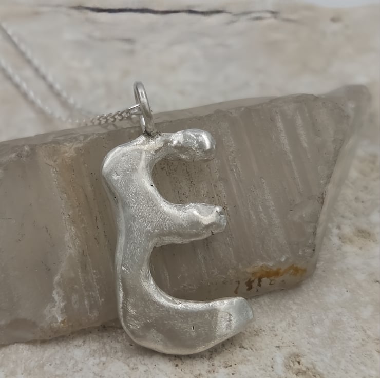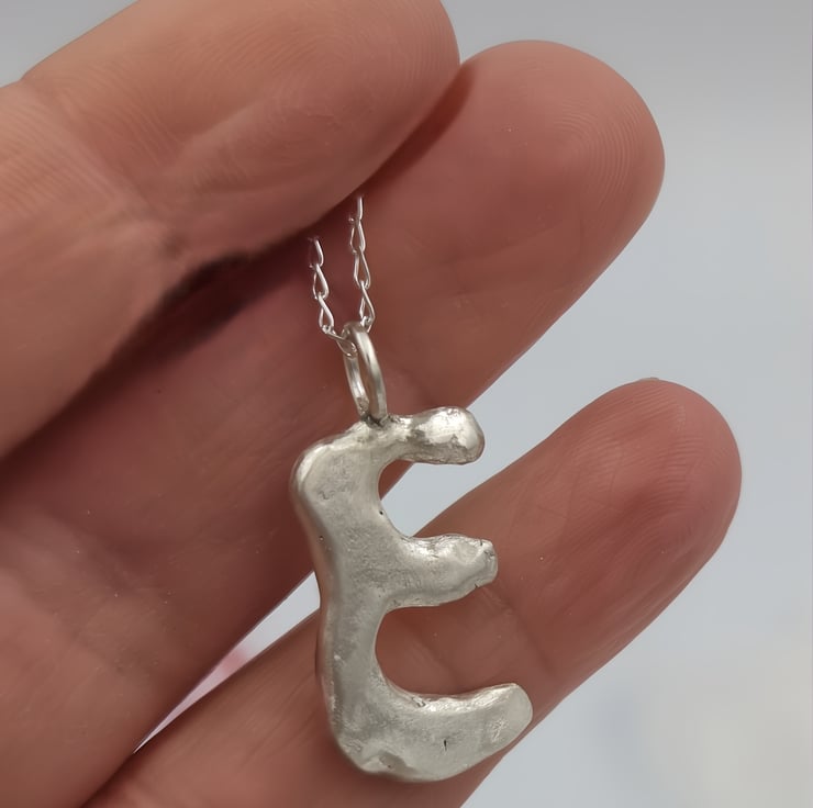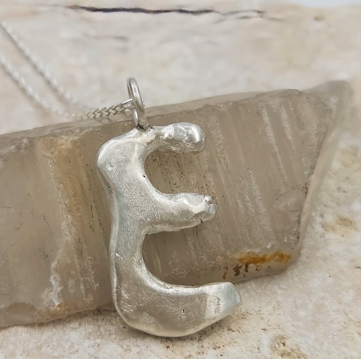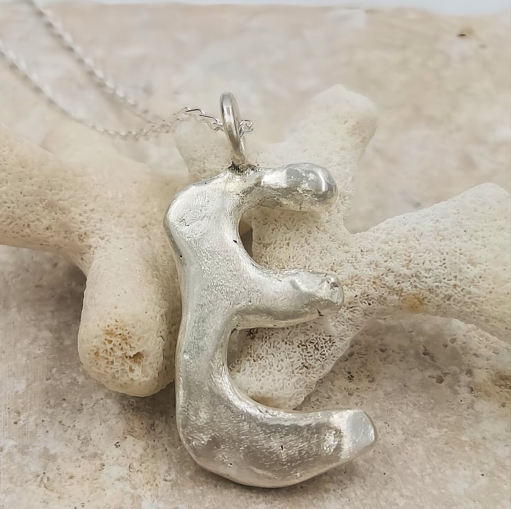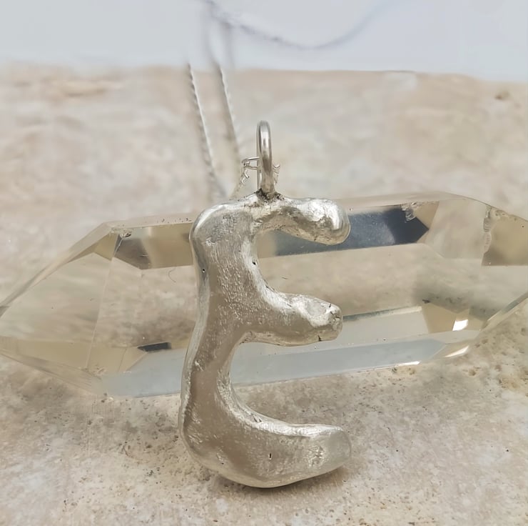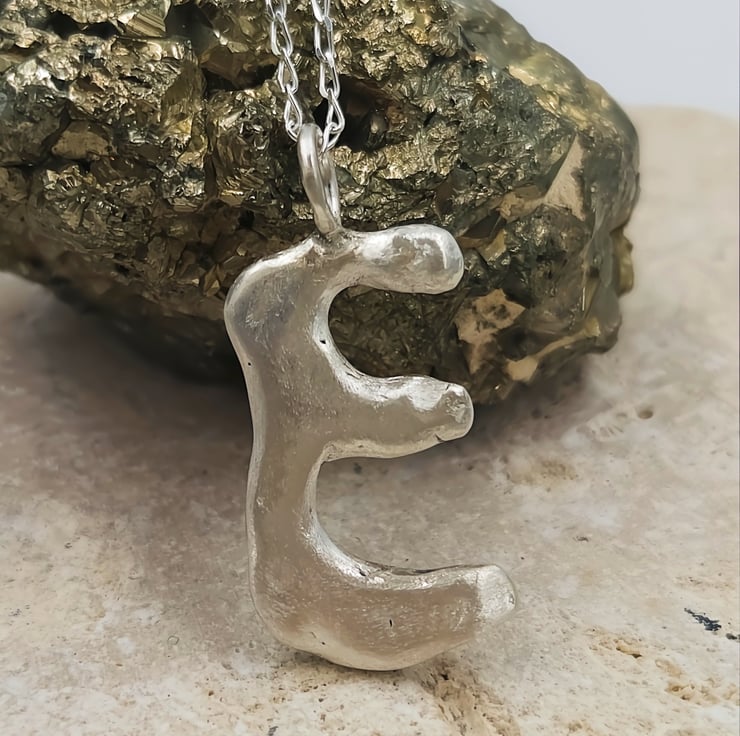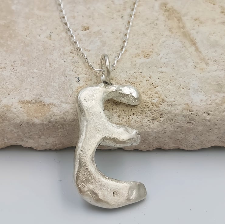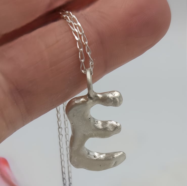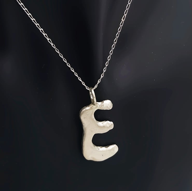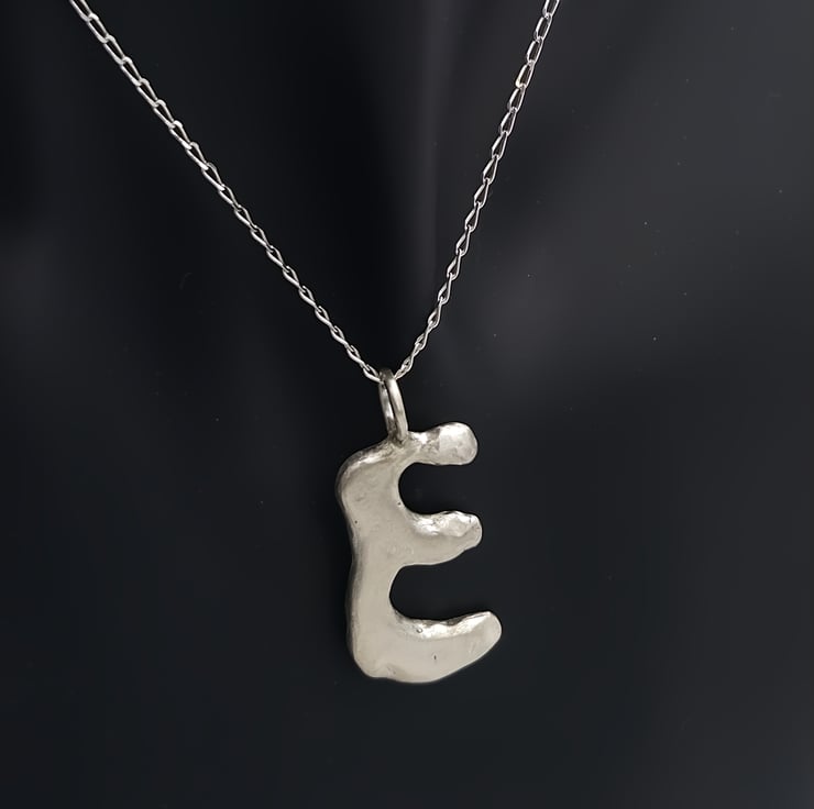 Unleash your style with a one-of-a-kind sterling silver 'E' pendant, crafted with a stunning molten design that captures the essence of individuality and elegance.