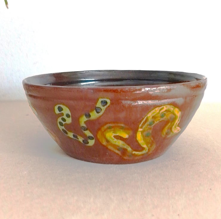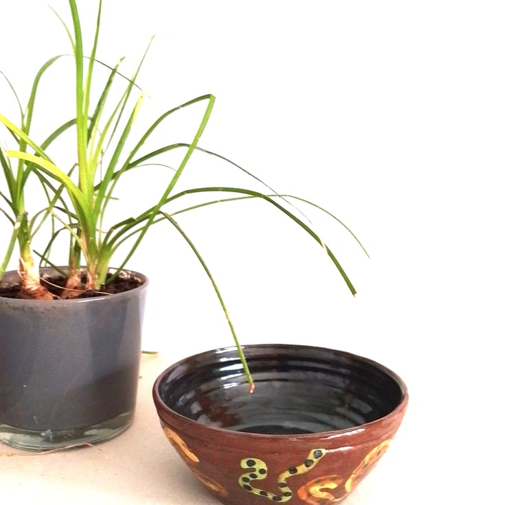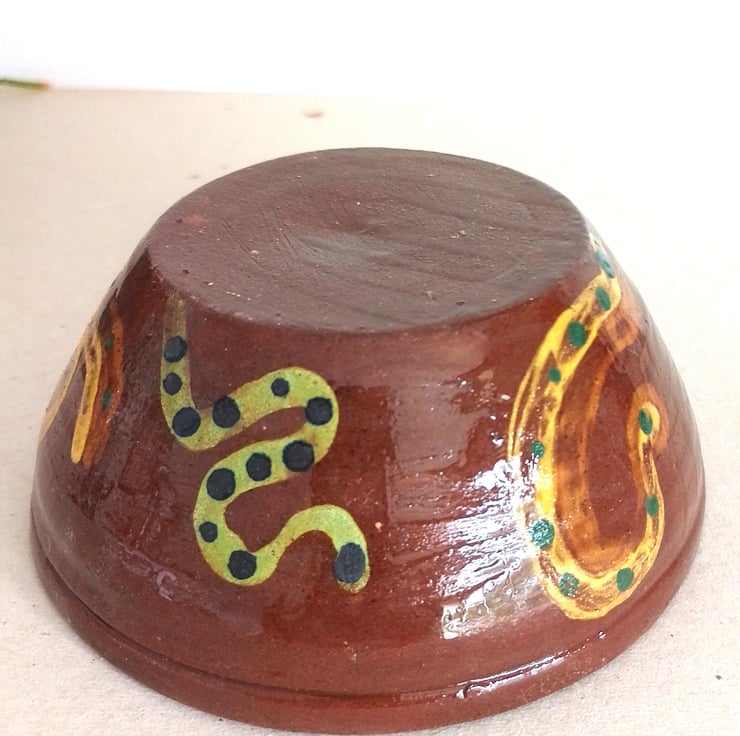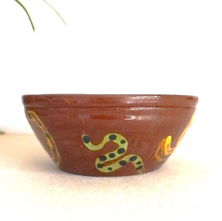 This is a medium size red terracotta food serving bowl. Made and designed by Penarth Ceramics. Suits hot or cold food or snack serving. Decorated in multicolored motifs and an interesting high glossy copper metallic green inside the bowl. Not microwave safe but dishwasher safe. Stands 5.3 cms x 12 cms wide. Capacity 350 mls