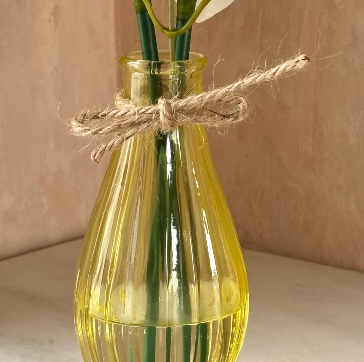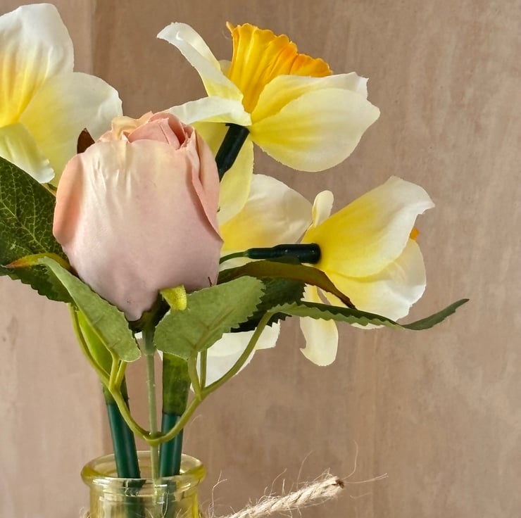 Set in high quality clear resin for a perfect water look, a beautiful bud collection in a yellow glass fluted vase with jute tie decoration. Daffodilsa pink rose for a beautiful forever display.