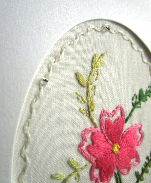 The flower is framed by an embroidered oval accented with beads, which sparkle beautifully in the light and further highlight the floral embroidery.
