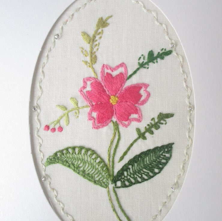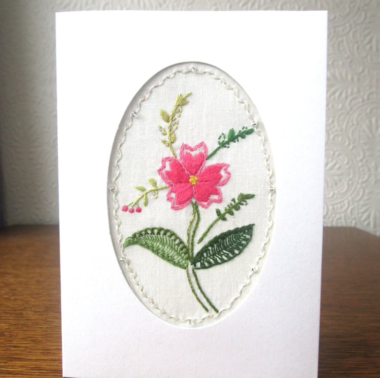This card features a bright pink flower and delicately embroidered leaves created with three different stitches on white fabric.