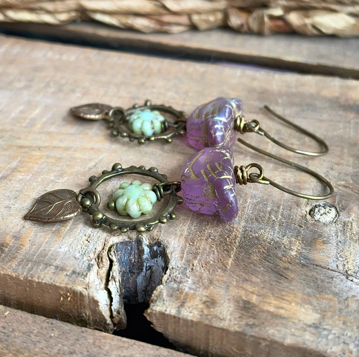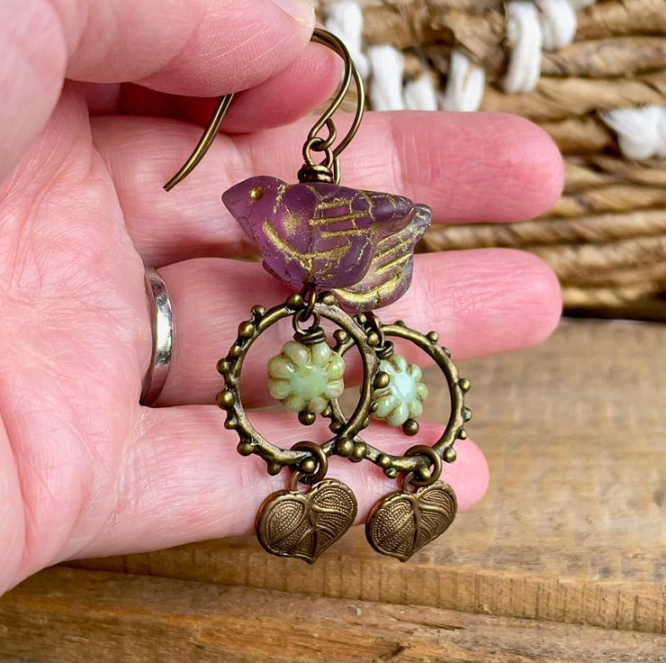 These nature-inspired earrings feature whimsical Czech glass bird beads in a vibrant lilac shade, finished with a soft golden wash that highlights their carved details.