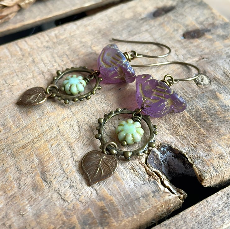 A beautifully detailed Vintaj brass leaf charm completes the design, giving the earrings a gentle woodland feel.
