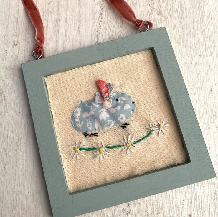 Handmade 4" hand embroidery frame features a lovingly crafted guinea pig in a whimsical, vintage-inspired appliqué design.