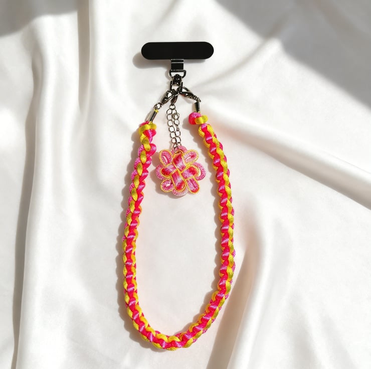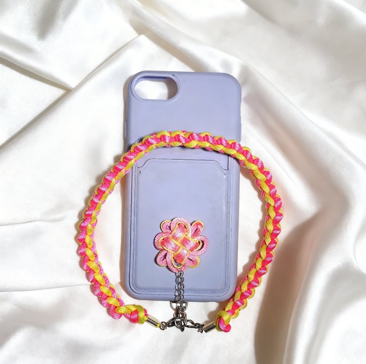 The bright pink and yellow cords give this macrame phone strap a lively and cheerful character. I paired the braid with a small auspicious knot charm, a traditional decorative knot that symbolises good luck and positive energy. Combining practical function with a meaningful motif, this strap is designed to keep your phone secure while adding a small touch of colour and charm to everyday life.