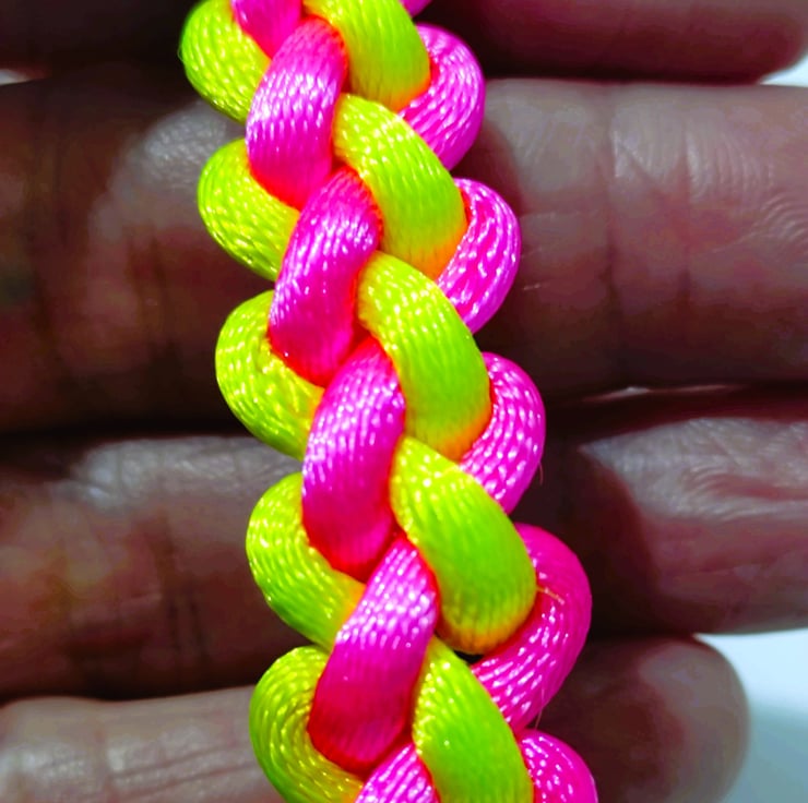 This handmade macrame phone strap is braided with vibrant pink and yellow cord, creating a cheerful and eye-catching accessory for your phone.