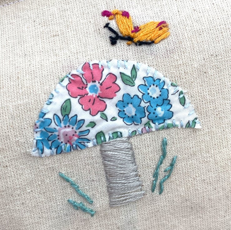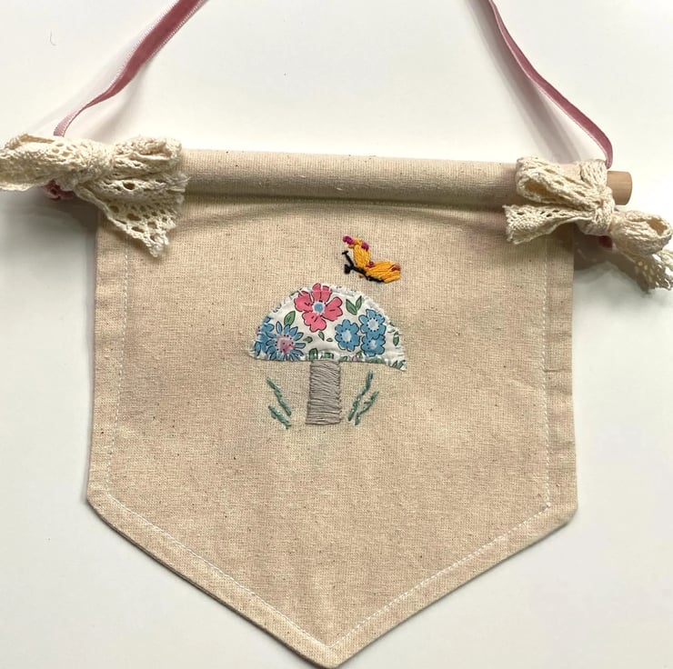 Hand Embroidered mushroom banner fabric decoration - mushroom made using Liberty print fabric