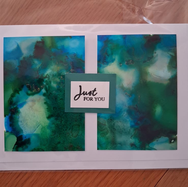 Handmade made card made using alcohol inks. Shades of green and blue. Envelope included.