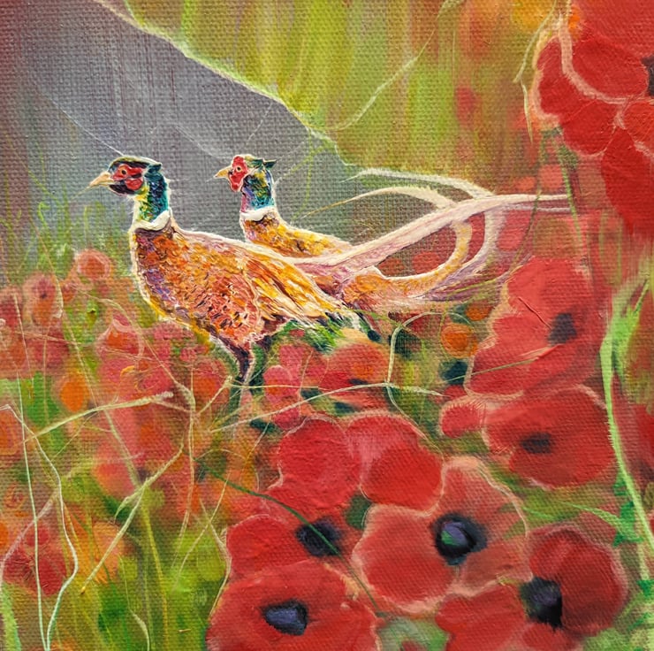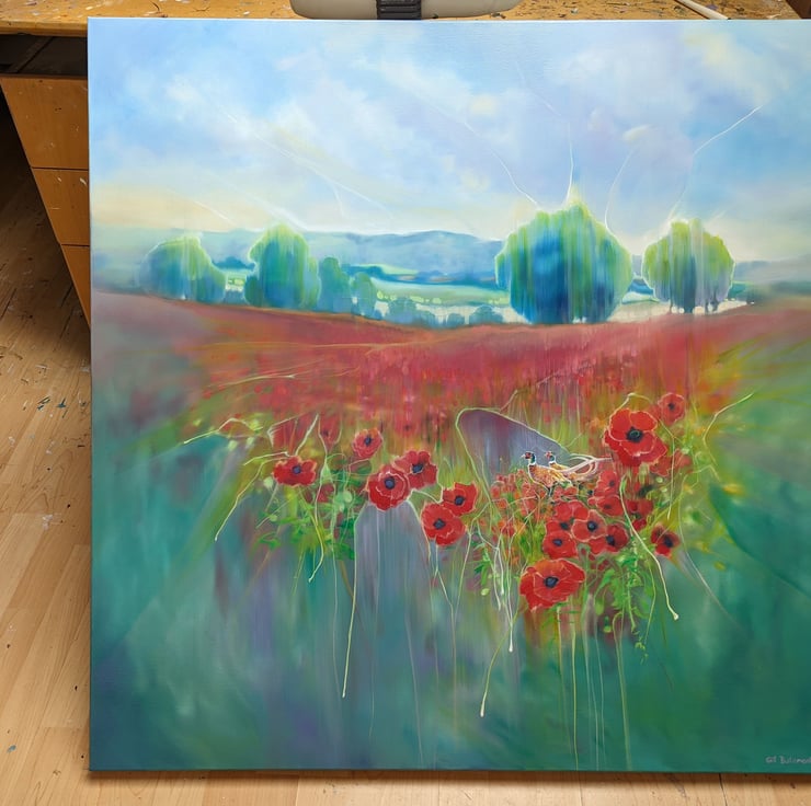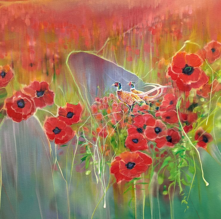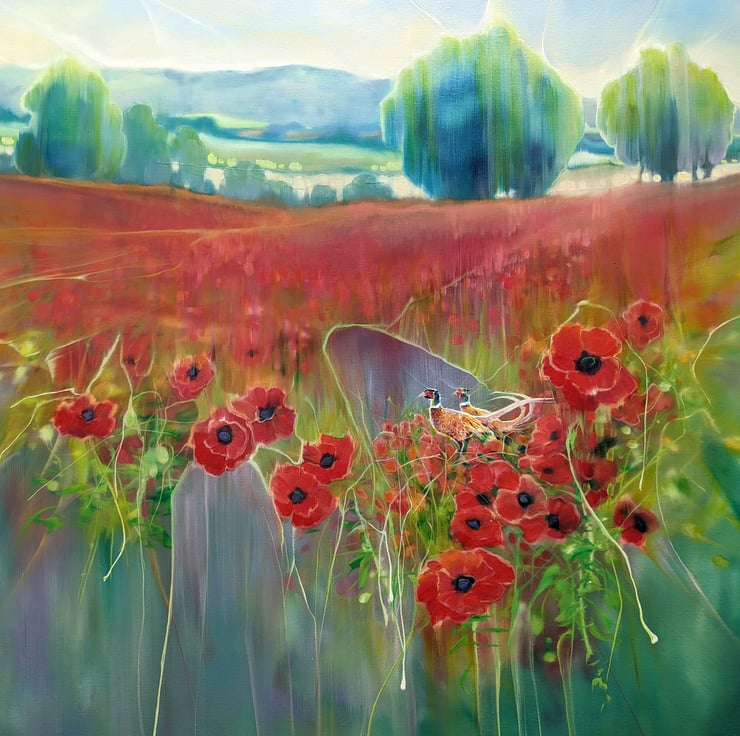 Beautiful England is a summertime poppies and pheasants inspired contemporary English landscape painting. It is 40x40x1.5 inches. The painting is semi abstract in style, predominantly in reds, greens and blues. It was made after a walk I took one August afternoon near Selmeston village which sits to the north of the South Downs hills near Alfriston. It sums up my joy of walking and my love of country landscapes - especially in summer when the wildflowers are out and the lovely idiot pheasants are squawking around in them. This painting is dedicated to all those people who are working to preserve our natural landscapes, nature, wildlife and birds and to anyone who is fighting stop the South Downs being built over. Painted on deep edge canvas, edges white, no frame necessary, ready to hang and comes with a certificate of authenticity