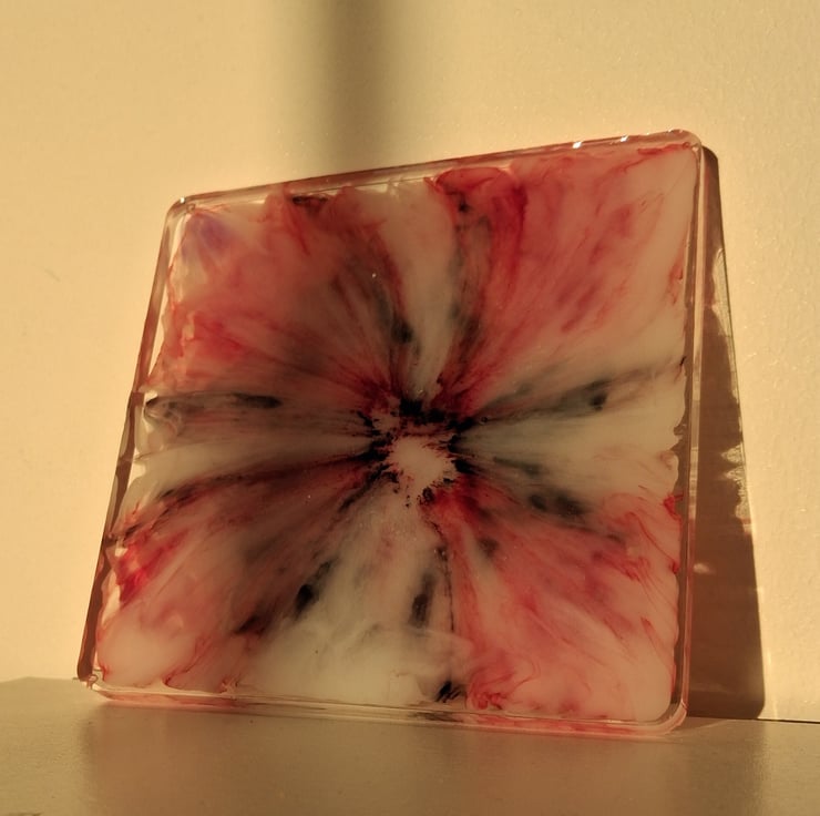 Handmade epoxy resin square coaster in shades of black, white and red