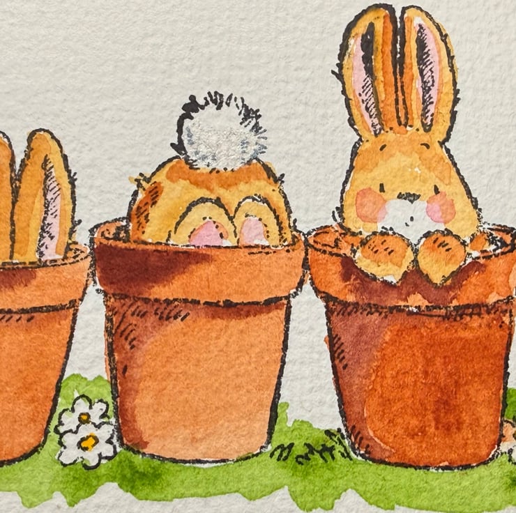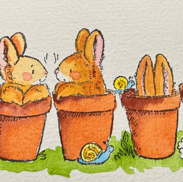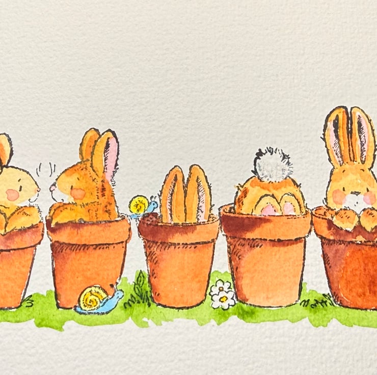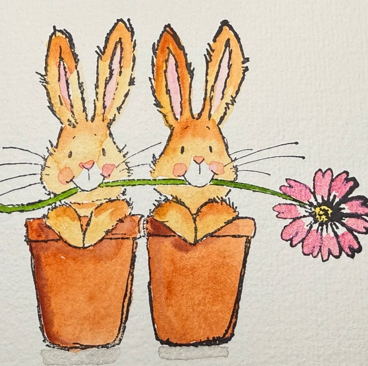 These bunny illustrations were chosen for their gentle humour and the sweet, expressive storytelling that Penny Black stamps capture so well. The idea of bunnies tucked into pots felt playful and full of personality—curious, shy, mischievous, and content all at once. Painting them by hand brings out those tiny character moments, while the unpainted option invites others to enjoy the creative process too.