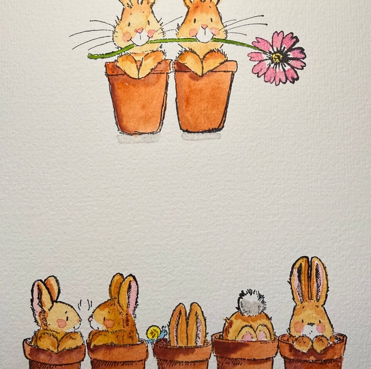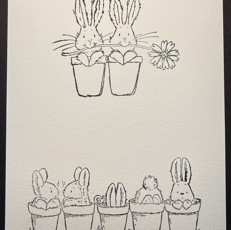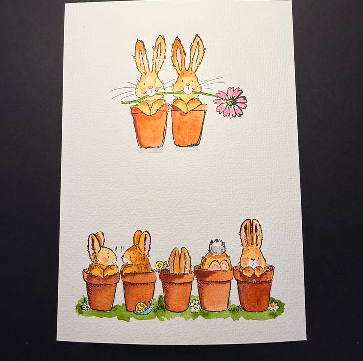 This listing is for an A5 sheet featuring two separate bunny illustrations, each created from original Penny Black stamp impressions and hand watercoloured on thick, high quality watercolour paper.