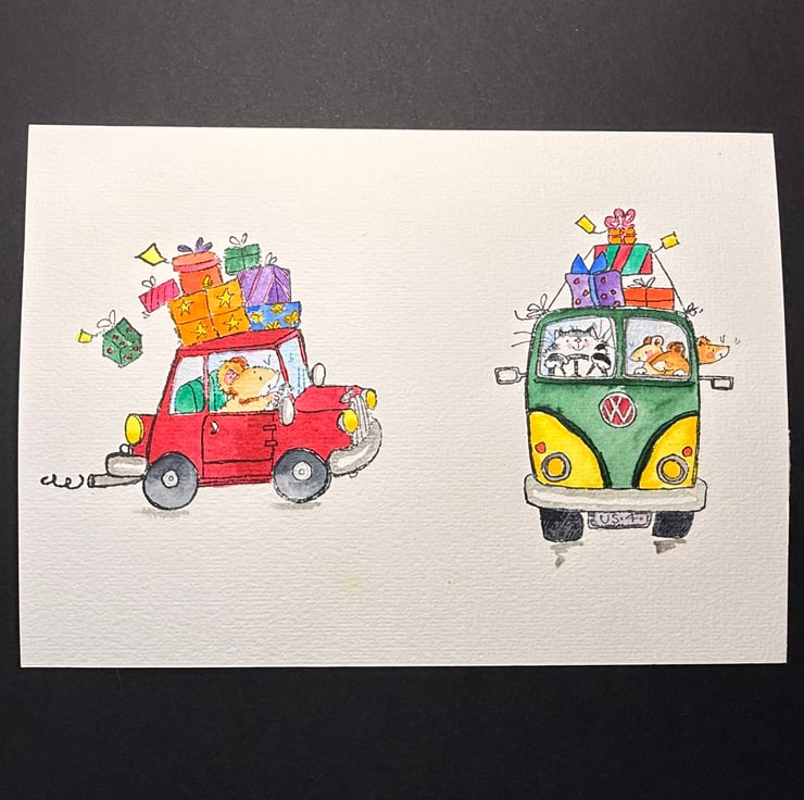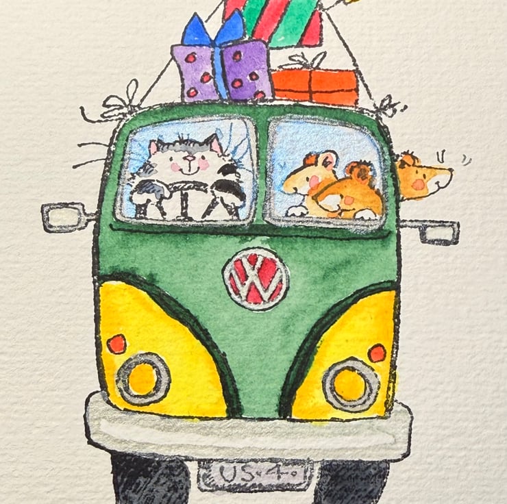 2. A cat driving a cheerful VW style van, complete with mouse passengers and even more gifts strapped to the top
