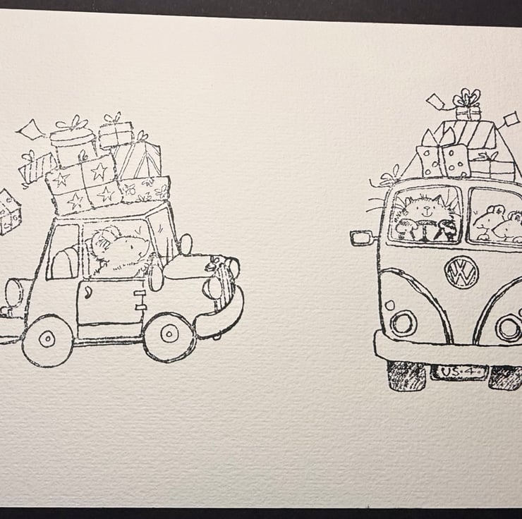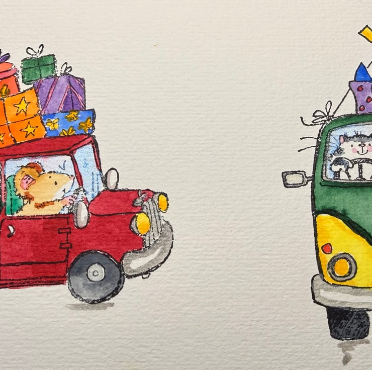These two illustrations were chosen for their sense of fun and movement — classic Penny Black storytelling full of personality. The mouse racing along with a mountain of presents captures that excited “on my way!” energy, while the cat driving a van full of mice feels like a tiny road trip in miniature. Hand‑painting them brings out the warmth and humour in each scene, while the unpainted option invites others to enjoy the creative process themselves.