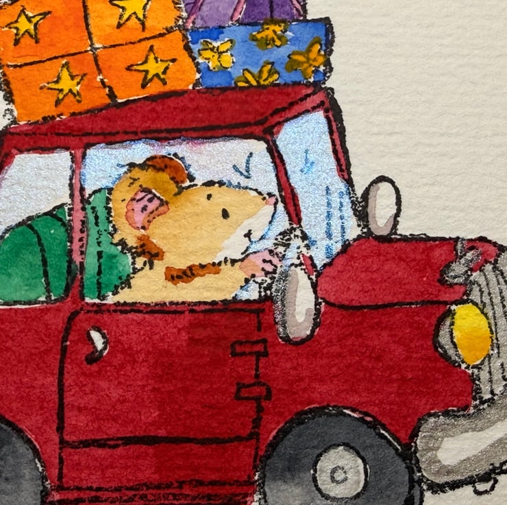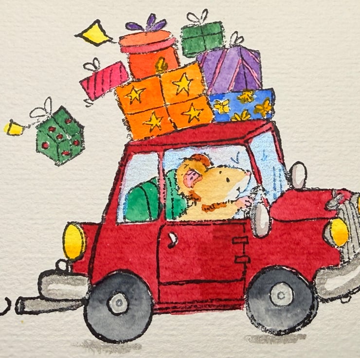 1. A mouse speeding along in a tiny car, the roof piled high with wrapped presents