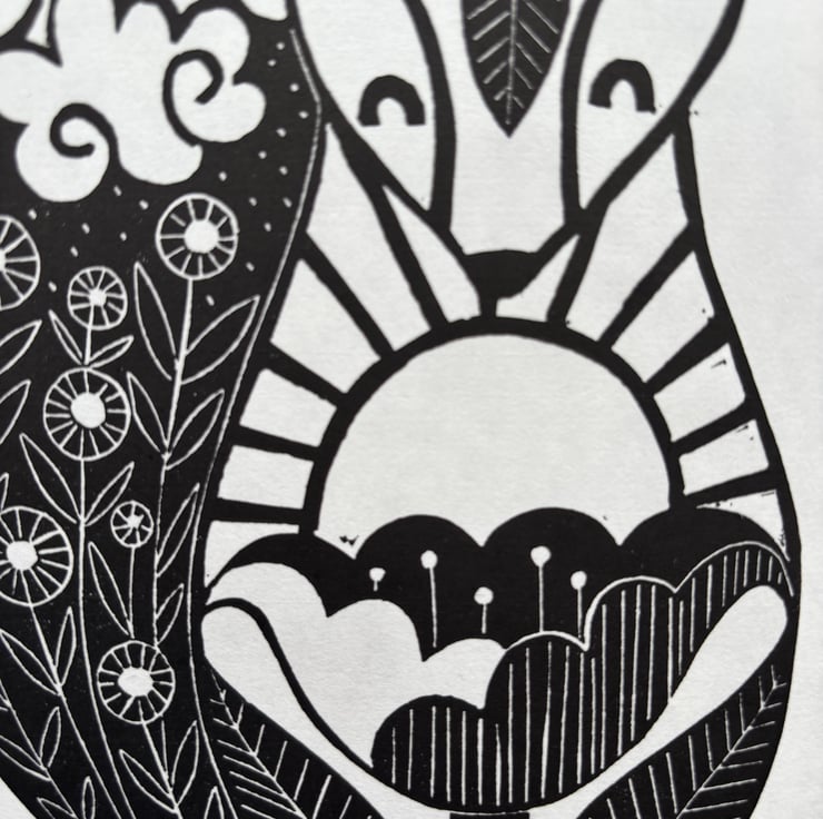 Created from my original design, the print you receive is hand printed on Japanese Ho-Sho paper, in black Cranfield ink. It is a mis-print so will be slightly imperfect, but still beautiful. The print measures approximately A4 and is unframed and unmounted. It will be wrapped in recycled tissue paper and sent in a tube/reinforced envelope.