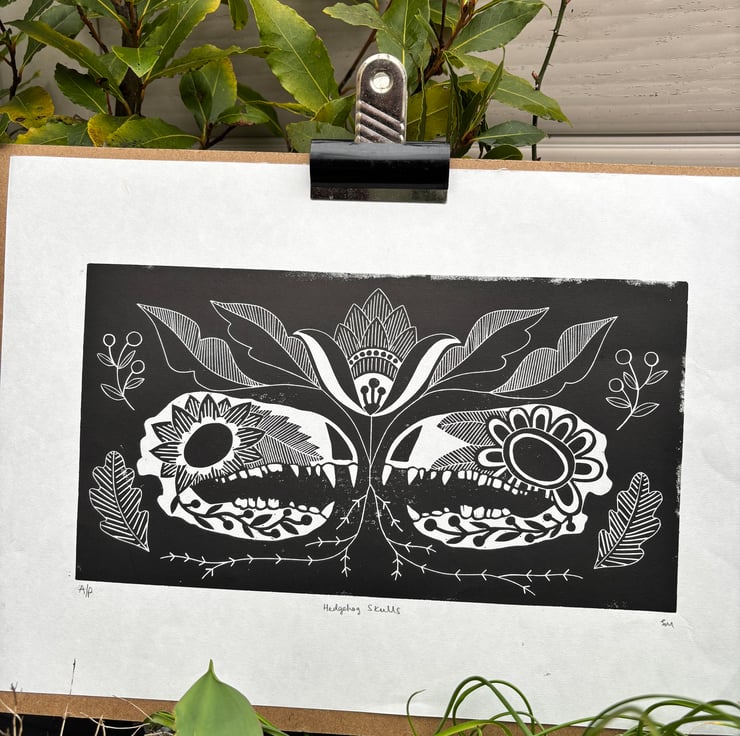 Two decorative hedgehog skulls either side of a beautiful folk art flower. Based on Ukrainian and Eastern European folk art.