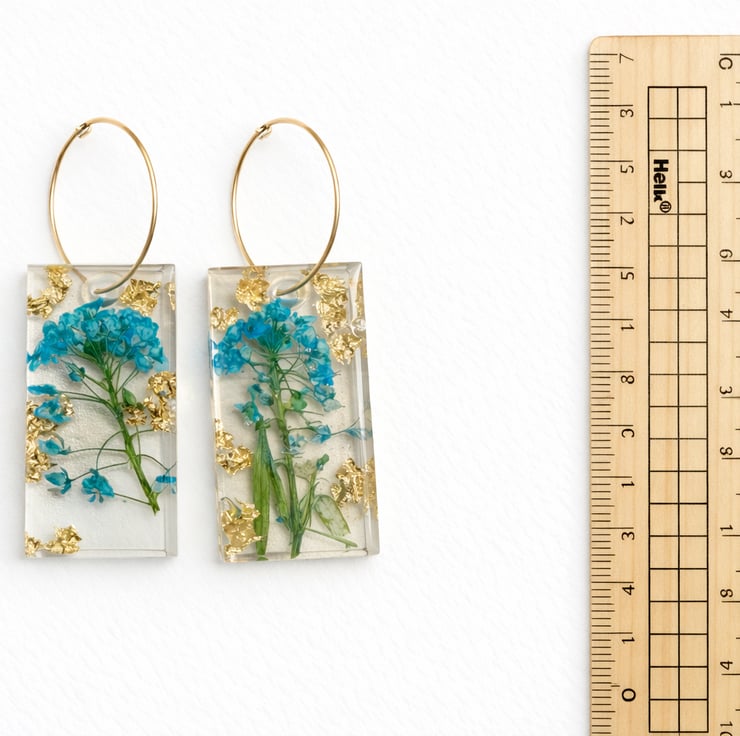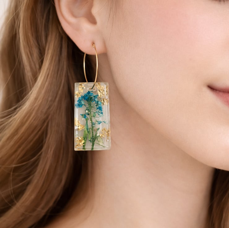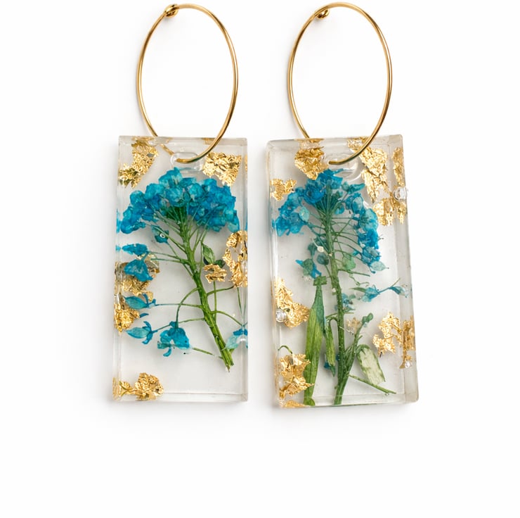 These earrings were inspired by the delicate beauty of wild meadow flowers. Real blue blossoms and gold leaf are preserved inside clear resin to capture the colours and textures of nature, creating a small wearable botanical display framed in a modern rectangular design.