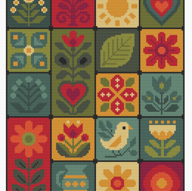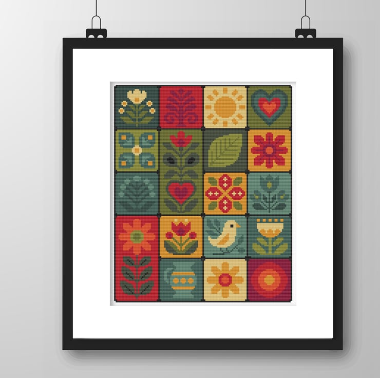 Folk Hearts and Garden Quilt style Sampler Cross Stitch Pattern (PDF Counted Chart 309)