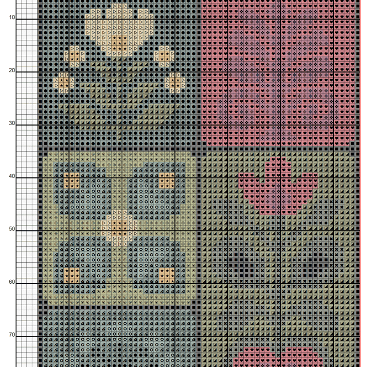 I have loved cross stitch all my life... I strive to make beautiful cross stitch patterns. Charts which are a breeze to use, split into four equal segments and as large as possible on A4 printable PDF's.