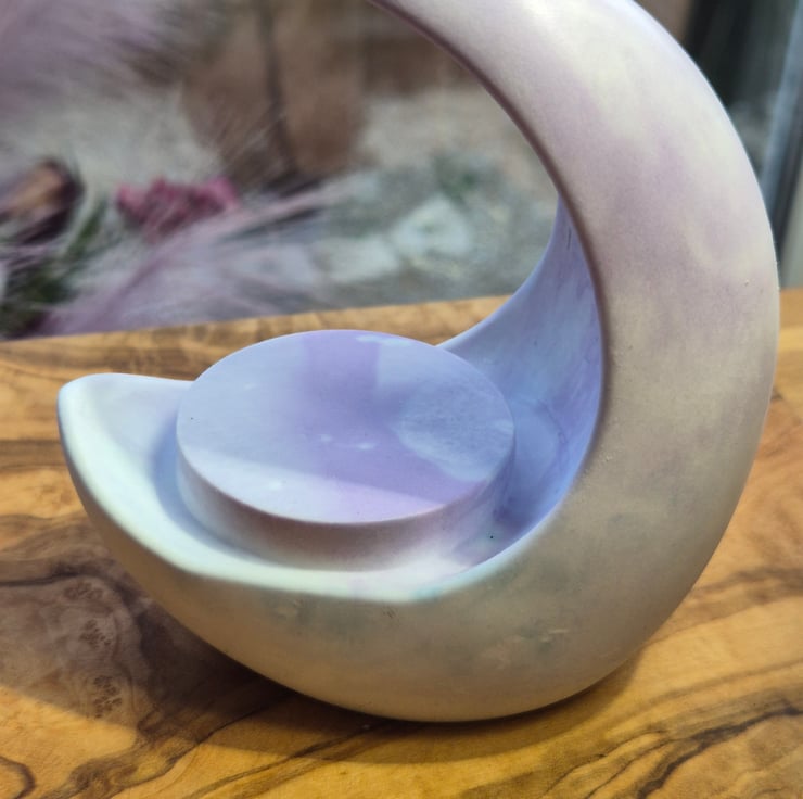 A modern handcrafted candle holder made from eco-friendly resin. Its smooth design and soft iridescent marble tones create a calming, elegant accent for any space. Perfect for coffee tables, shelves, or relaxing spa-style décor.