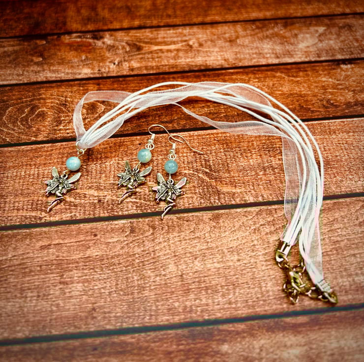 Add a little magic to your jewellery collection with this handmade fairy necklace and earrings set, featuring delicate fairy charms and beautiful Morganite gemstone beads.