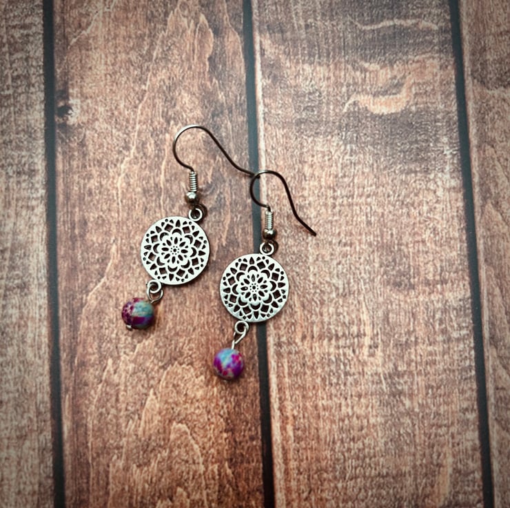 These handmade Imperial Jasper earrings feature beautifully detailed mandala-style charms paired with vibrant Imperial Jasper gemstone beads.