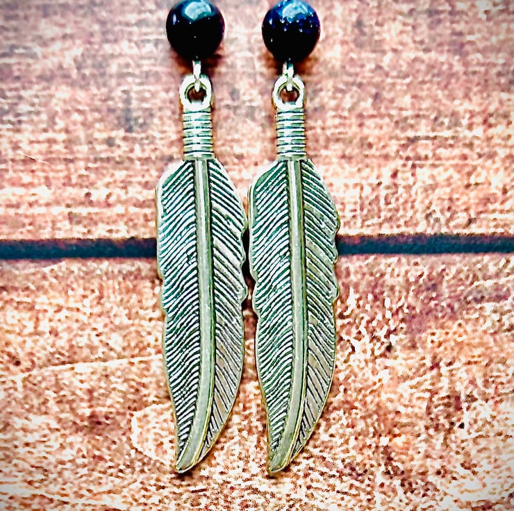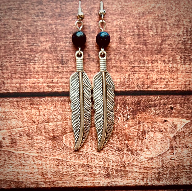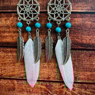 The intricate dreamcatcher pendant is paired with delicate feather charms and shimmering Blue Goldstone beads, creating a beautiful boho-inspired jewelry set that sparkles subtly in the light.