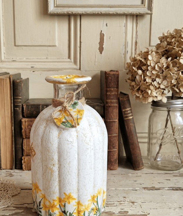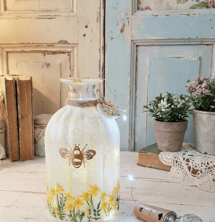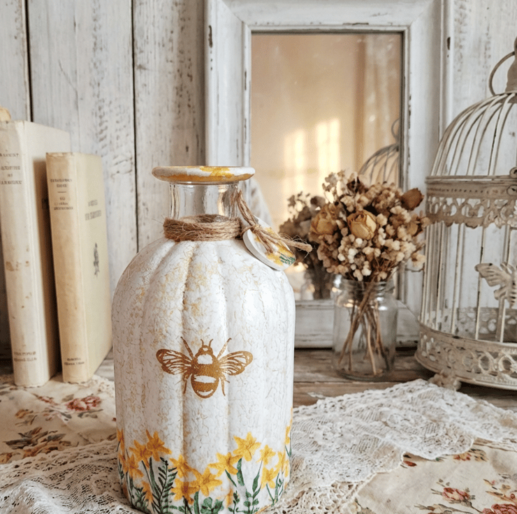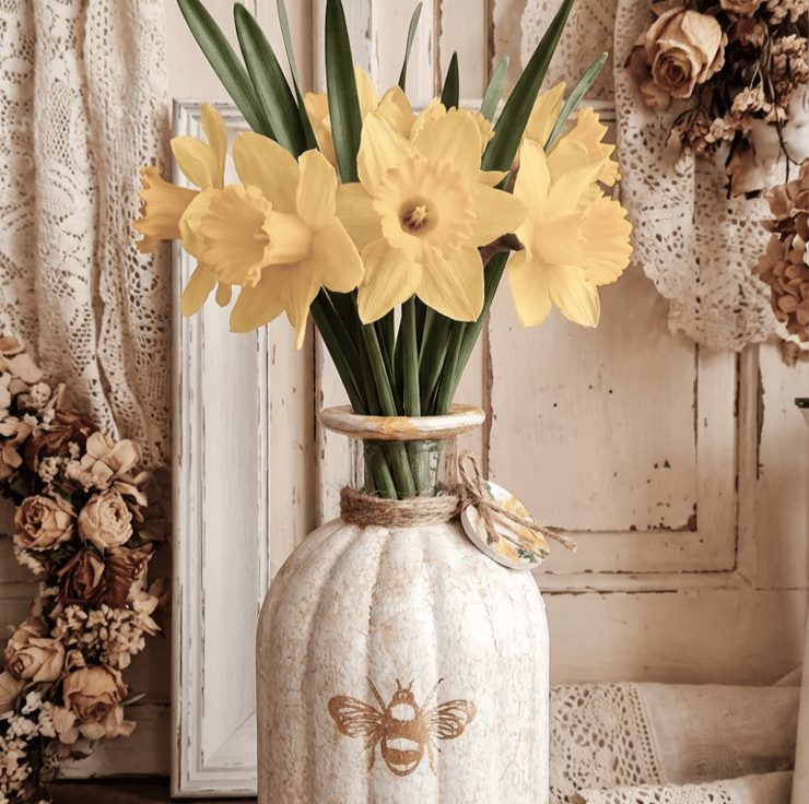 Pretty daffodil florals have then been added around the vase to feature a gold bee on the front.