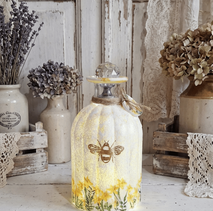 With the addition of battery fairy lights, with a crystal topper, this makes it into a lovely Lamp with a soft glow.